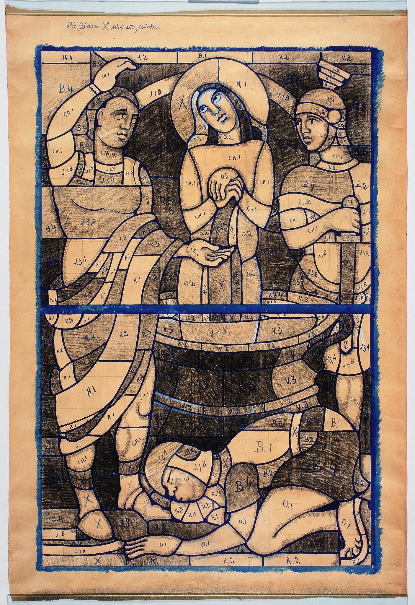 Ce carton fait partie d’une série de quatre oeuvres préparatoires liées au vitrail de saint Jean, conservées dans le fonds graphique de l’atelier Kirsch & Fleckner au Vitrocentre Romont (KF_284 ; KF_285 ; KF_286 ; KF_287). La paroisse de Saint-Pierre possède également dans ses archives les maquettes de ces premières verrières. Ces projets, à l’exception de rares scènes, s’apparentent à des dessins définitifs, puisqu’ils n’ont fait l’objet d’aucune modification en ce qui concerne les couleurs, le dessin et le réseau des futurs plomb, qui sont identiques au vitrail.