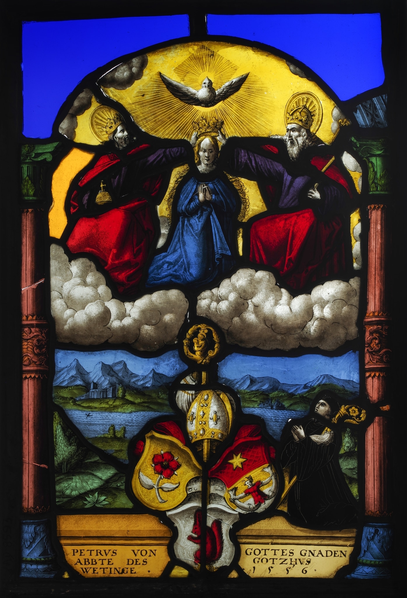 Un Couronnement de la Vierge similaire figure sur un premier panneau commandé par Peter Eichhorn en 1544 avant qu’il ne devienne abbé. Celui-ci, attribué au peintre verrier Caspar Stillhart, est aujourd’hui conservé au Victoria and Albert Museum à Londres (VAM_82). Le vitrail de Genève et sa composition mêlant Couronnement de la Vierge et paysage lacustre, sans fond damassé, a probablement servi de modèle au peintre verrier zurichois qui a exécuté un panneau aux armes de Hans Müller vers 1573 pour le couvent de Muri (Hasler, 2002, p. 207).