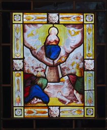 Vitrail rectangulaire représentant l’Adoration du Christ par les mages. Au centre se trouvent l’Enfant et la Vierge Marie surmontés de l’étoile et entourés par les rois qui s’inclinent en offrant leurs présents. La composition centrale est encadrée dans une bordure ornée de fleurs, de rosaces et de mascarons, elle-même montée dans un pourtour moderne noir et dans une vitrerie à losanges du XIXe siècle.