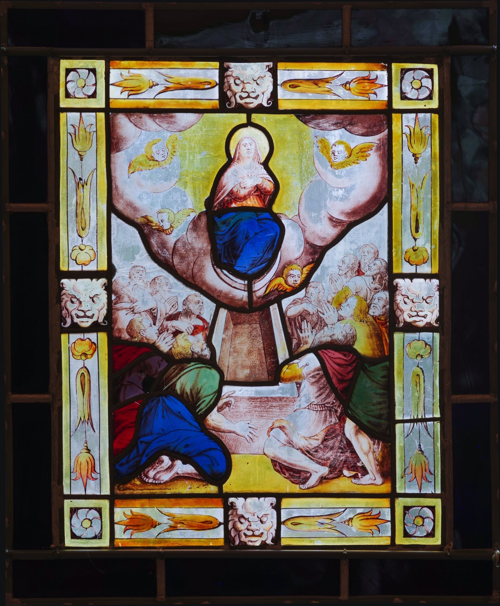 Vitrail rectangulaire représentant l’Assomption de la Vierge Marie, assise sur un croissant de lune, s’élevant dans une nuée entourée de quatre têtes d’anges ailées. Dans la partie inférieure, des apôtres sont agenouillés de part et d’autre du tombeau vide observent la scène les mains jointes. La composition centrale est encadrée dans une bordure ornée de fleurs, de rosaces et de mascarons, elle-même montée dans un pourtour moderne noir et dans une vitrerie à losanges du XIXe siècle.