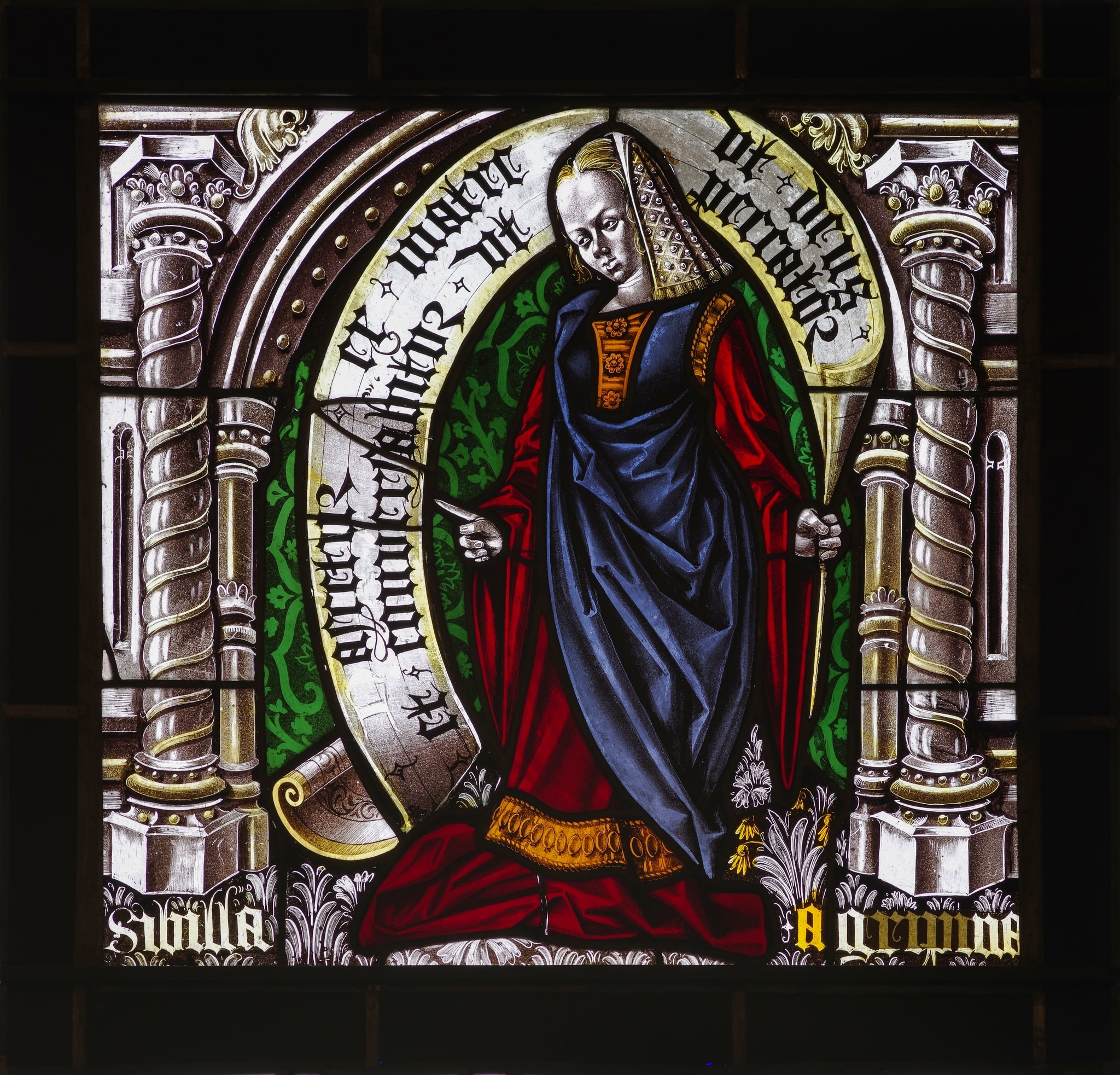 Vitrail représentant une femme en pied, vêtue d'un costume du XVIe siècle et portant un phylactère. Le personnage est placé dans un cadre architectural sous un arc brisé, sur un fond damassé et un sol tapis de végétaux.