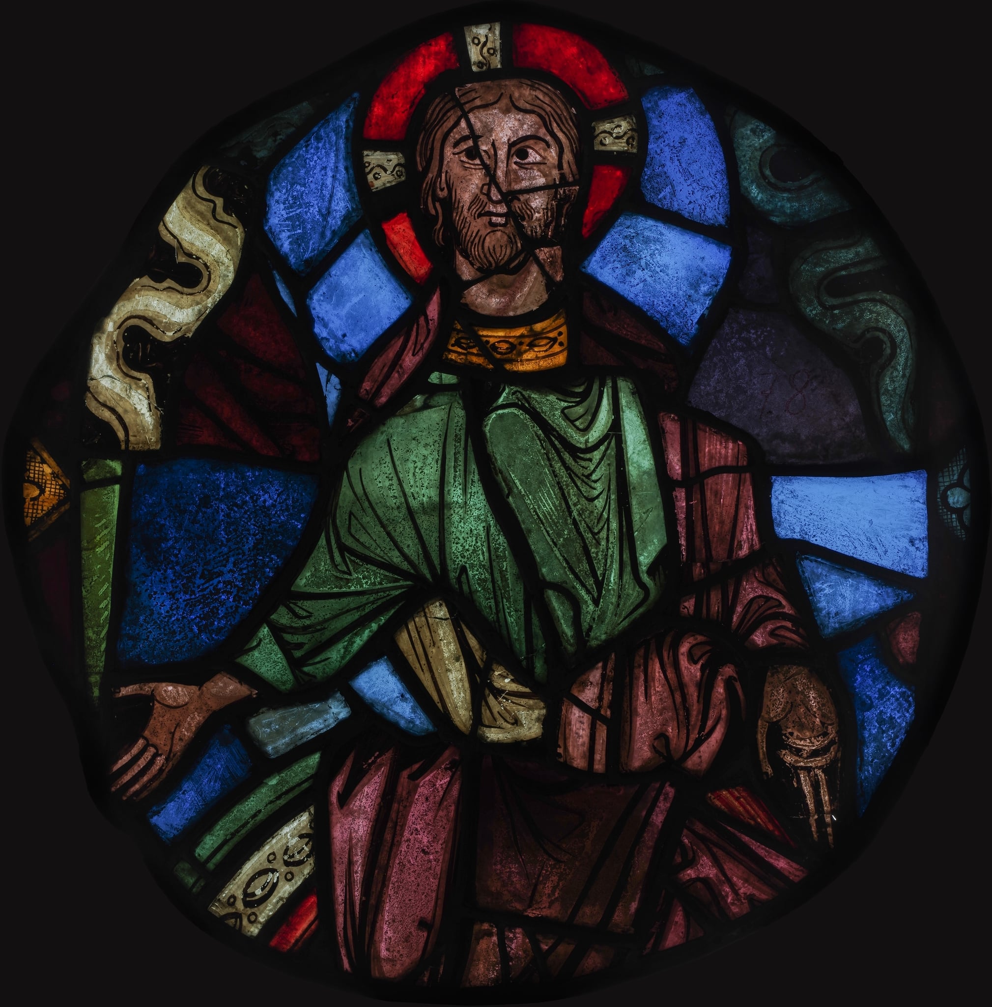 Ce médaillon fait partie d’un ensemble de vingt-trois panneaux connus à ce jour, provenant de l’église Saint-Ferréol à Saint-Fargeau, dans l’Yonne en France. Malgré l’état fragmentaire et fortement remanié du groupe, les différents épisodes illustrés peuvent être rattachés à des thèmes christologiques qui s’articulent autour de la Passion du Christ, de la Vie de la Vierge et du Jugement dernier, ou hagiographiques, essentiellement centrés sur les saints Pierre, Paul, Blaise, François et Vincent.