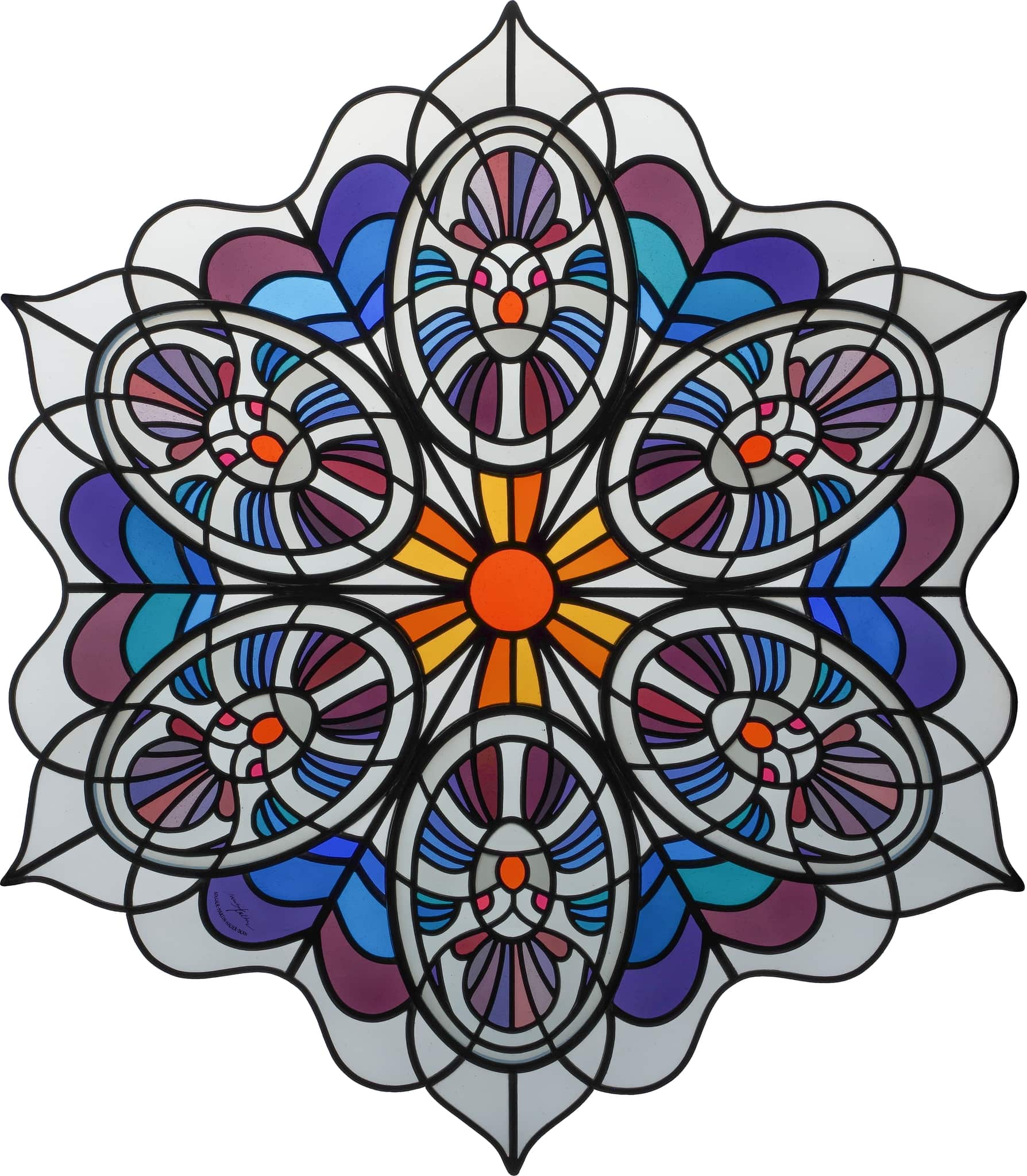 Pour ce présent vitrail, l’artiste crée une forme de tridimensionnalité. Au lieu de mettre en plomb l’ensemble de son mandala à plat, il a détaché les six pétales ovales de la structure plane, surélevant l’extrémité de chacune d’elles de quelques millimètres à l’aide de deux pièces métalliques disposées de chaque côté de l’ovale donnant ainsi non seulement du volume à son mandala mais aussi une forme de légèreté, cette surélévation créant des ajours permettant à la lumière de pénétrer par les côtés.