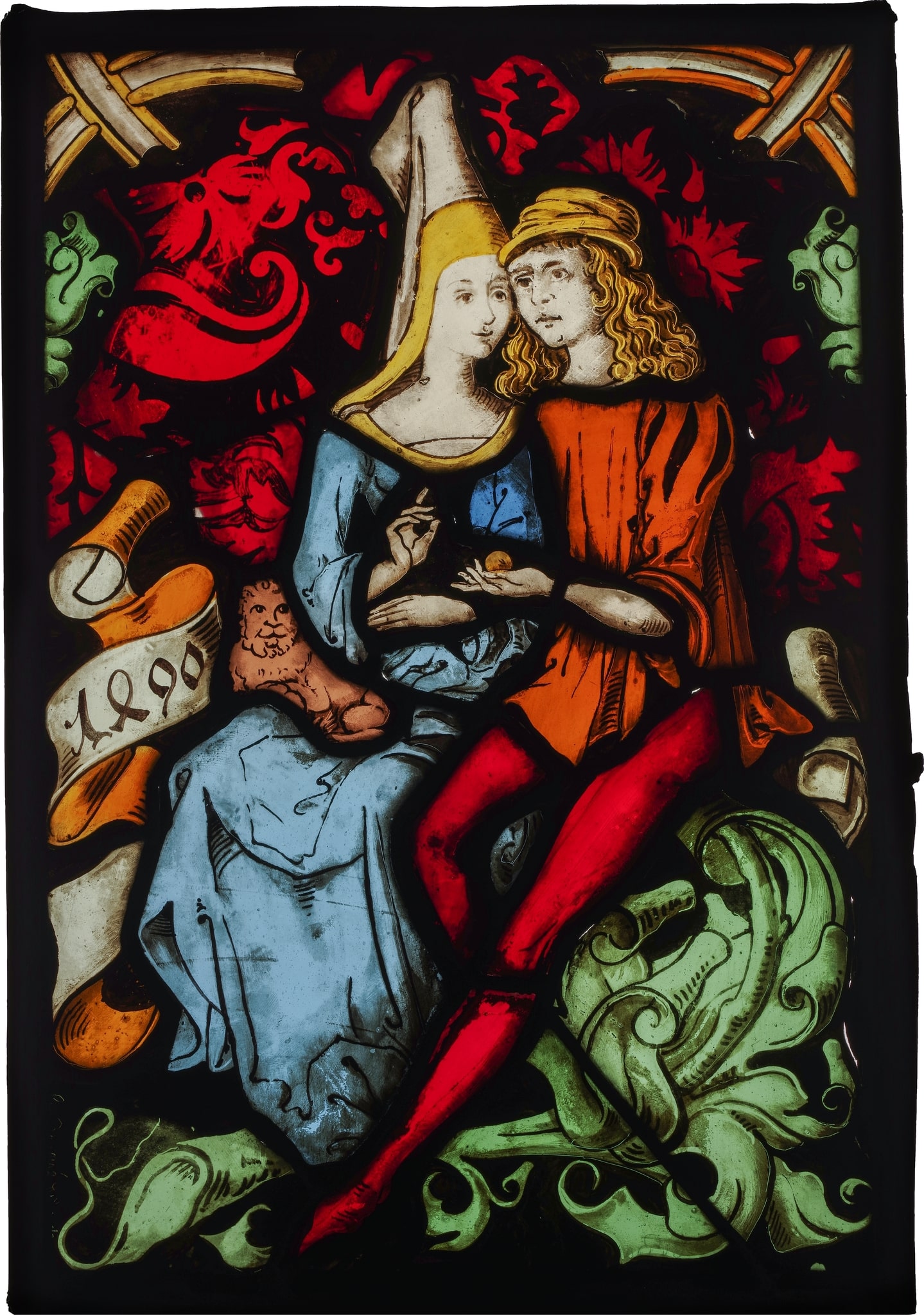 Sur un fond damassé rouge, un couple d'amoureux assis côte à côte, leurs visages se touchant, se regardent. Le jeune homme à droite, peut-être un berger, montre à sa bien aimée, coiffée d’un hennin, un objet rond et doré qu’il tient dans sa main que celle-ci s’apprête à saisir. Un animal, probablement un chien, est assis sur ses genoux. Des ornements végétaux verts et rouges encadrent la scène, ainsi qu’un phylactère à gauche se dressant en spirale et sur lequel il y a une date.