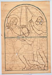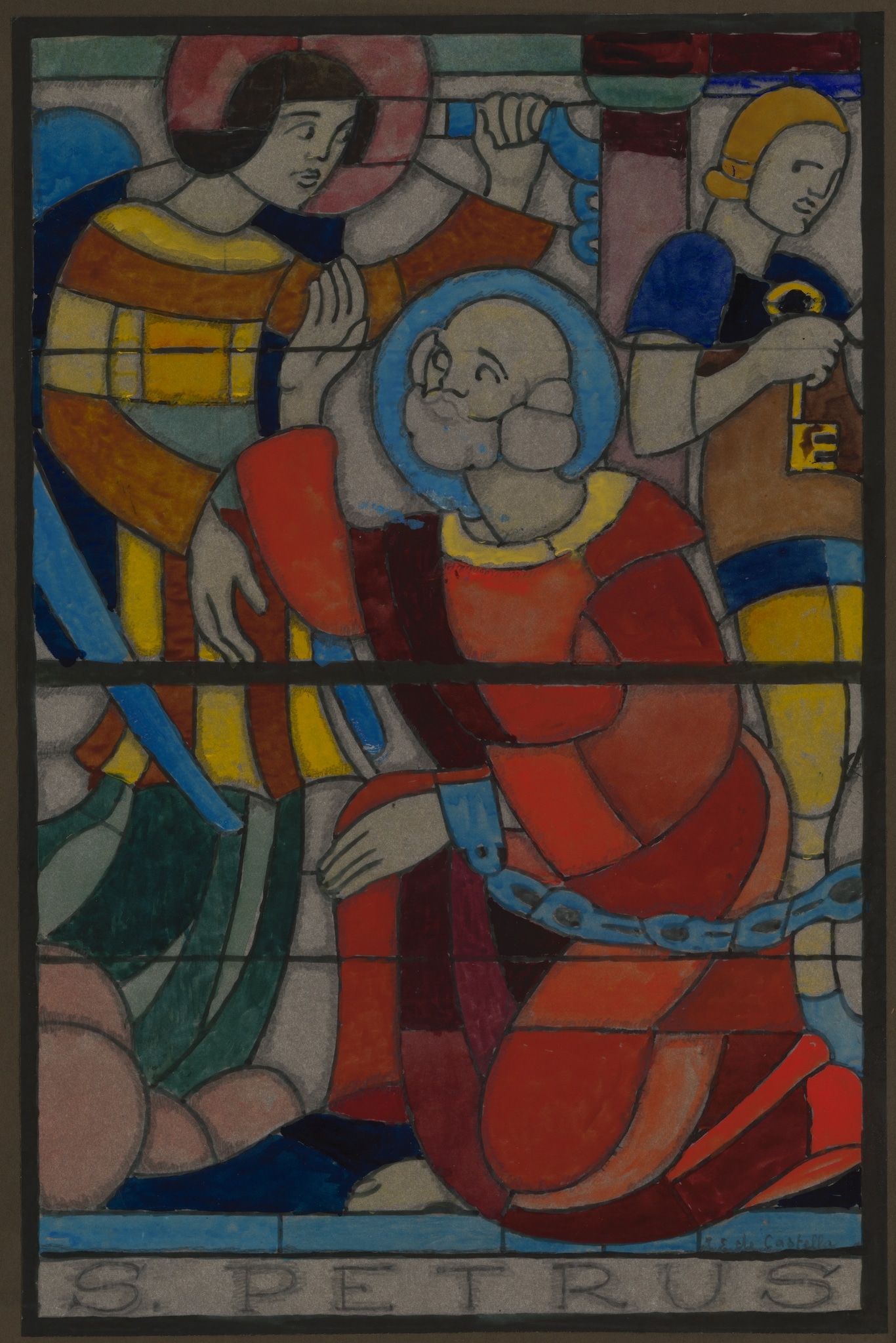 Cette maquette en couleur à l’échelle réduite est un projet pour la quatrième scène depuis le haut du huitième vitrail à gauche de la nef de l’église Saint-Pierre de Fribourg, consacré à saint Pierre. La scène représentée est tirée des Actes des apôtres (Ac 12:16-19). Les seize vitraux de la nef sont l’oeuvre de l’artiste Jean-Edouard de Castella et de l’atelier fribourgeois A. Kirsch & Cie.