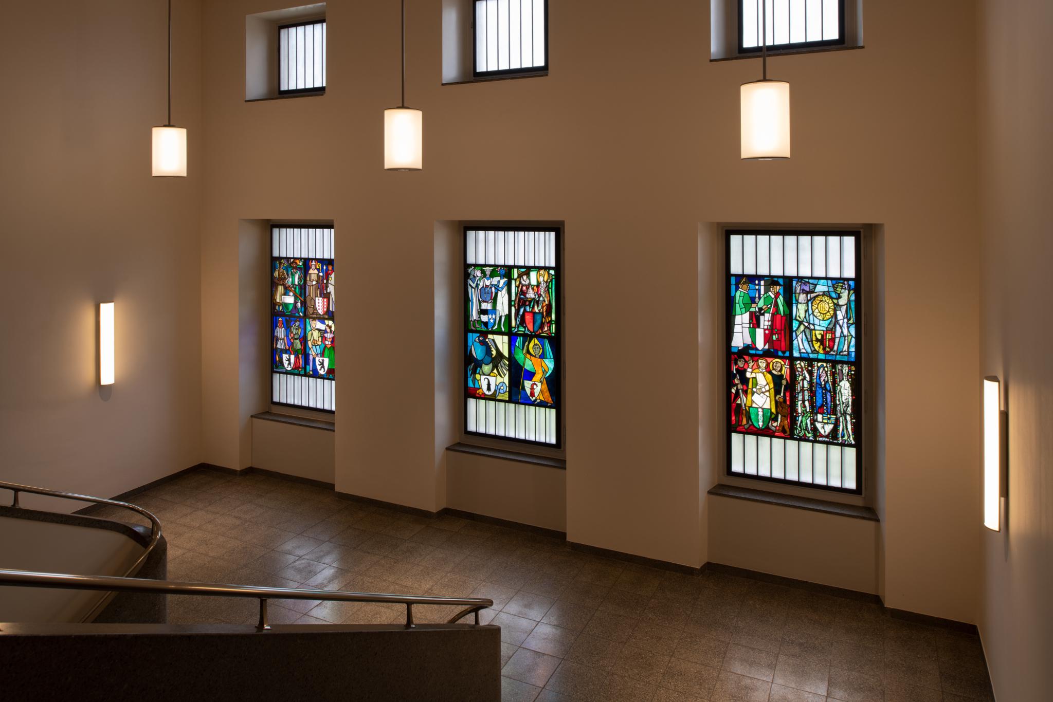 1960/61 gestifteter Wappenscheibenzyklus von 24 Kantonen, geschaffen von verschiedenen GlasmalerInnen.