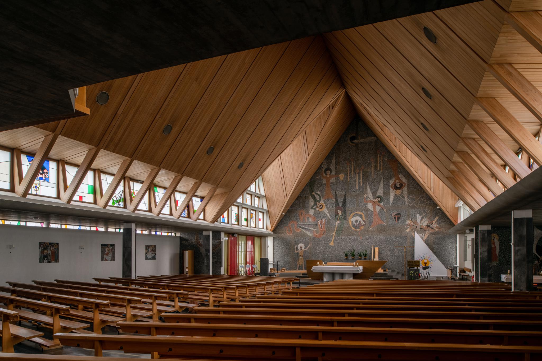 1957–58 von Fritz Metzger erbaut. Monumentale Glasmalereien mit christlichen Symbolen von Johann Jakob Zemp und Heinrich Gottlieb Mäder in Küsnacht.