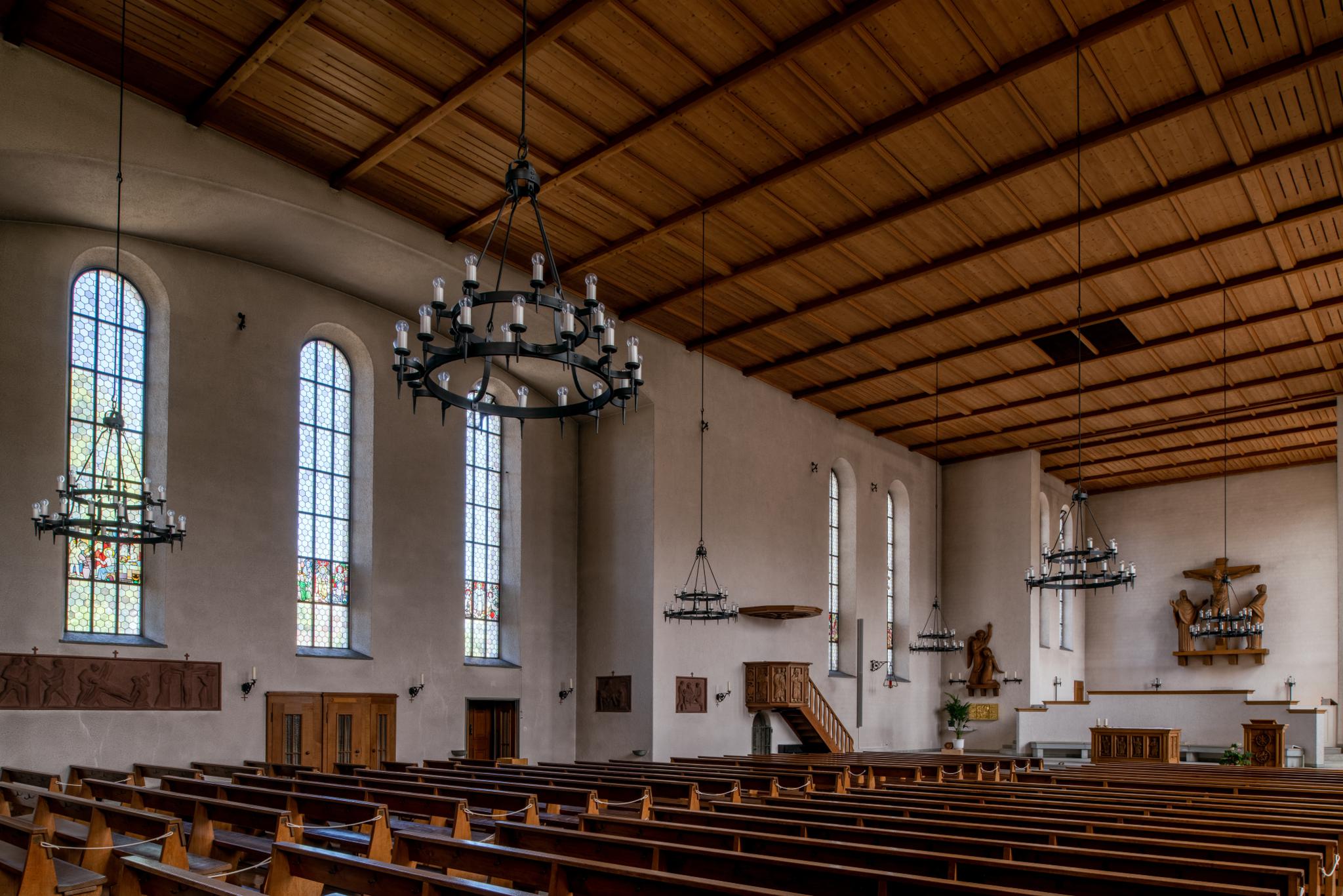 1874 von Johann Jakob Brenner neu erbaut. Für diesen Neubau schuf Johann Jakob Röttinger Glasmalereien (Brief vom 28.02.1875, Kirchgemeindearchiv Herdern, B 17.2.05 Kirchenneubau 1875/76). Vermutlich bei der Modernisierung der Kirche 1938–39 durch Karl Zöllig wurden diese Glasmalereien entfernt. Die neuen Fenster, ein Zyklus zum Marienleben und Christi Jugend, stammen vom Berner Glasmaler Albin Schweri. In der Sakristei sind ausserdem vier in Glas gebrannte Wappen, darunter dasjenige des Bischofs Franz von Streng, angebracht.