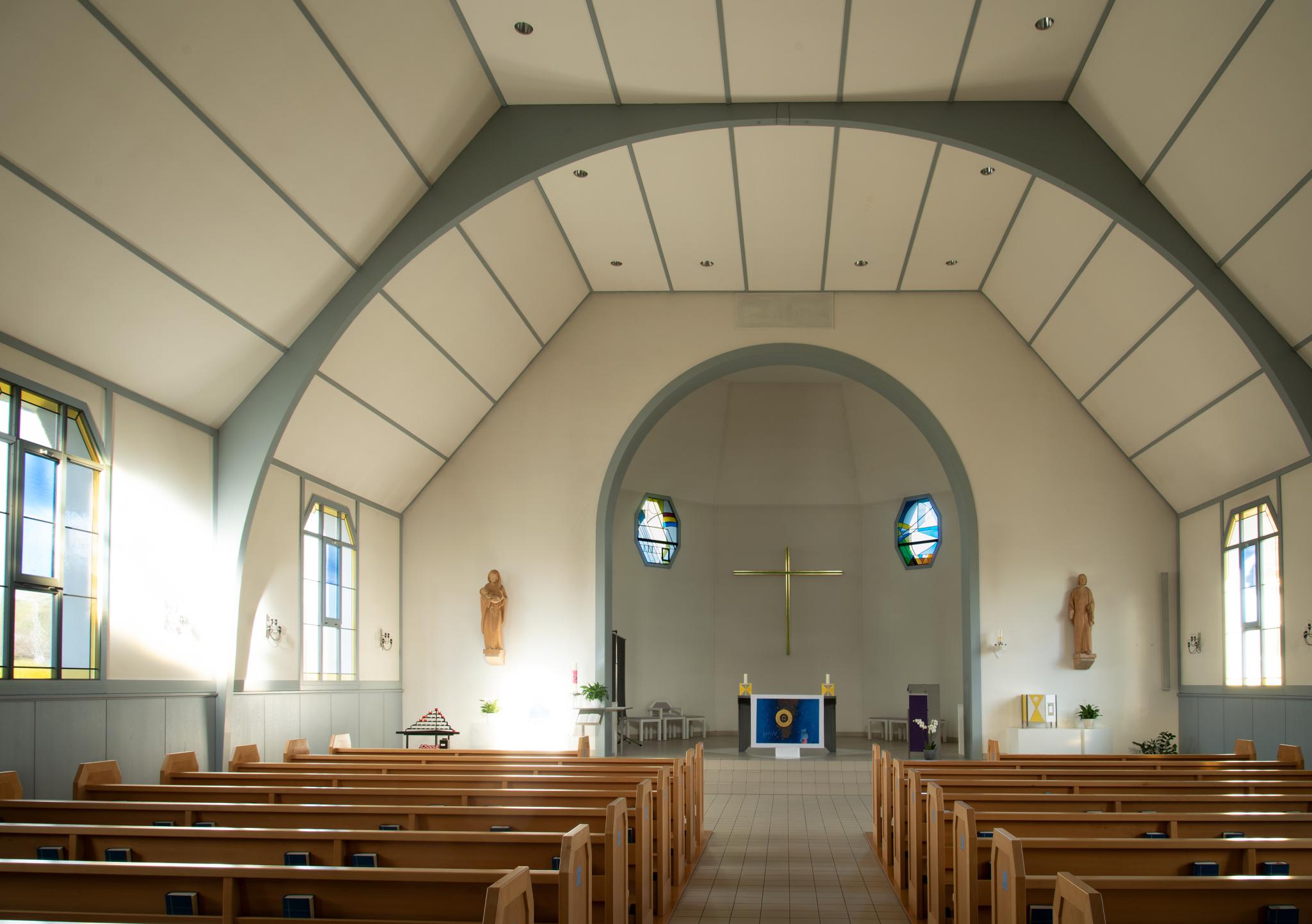 Verputzter Holzbau. 1958 aus Schlieren nach Bürglen versetzt, renoviert 1991. Chorverglasung, Altar und Taufbecken von Walter Burger.