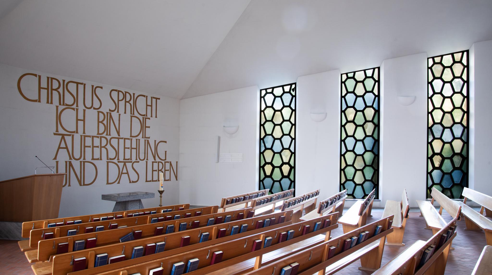 Seckseckige Kapelle mit Betonverglasung, 1958 von Jakob Hunziker erbaut, Türgestaltung von Max Hunziker und Karl Ganz. Zwei Fenster im Norden, drei Fenster im Südosten.