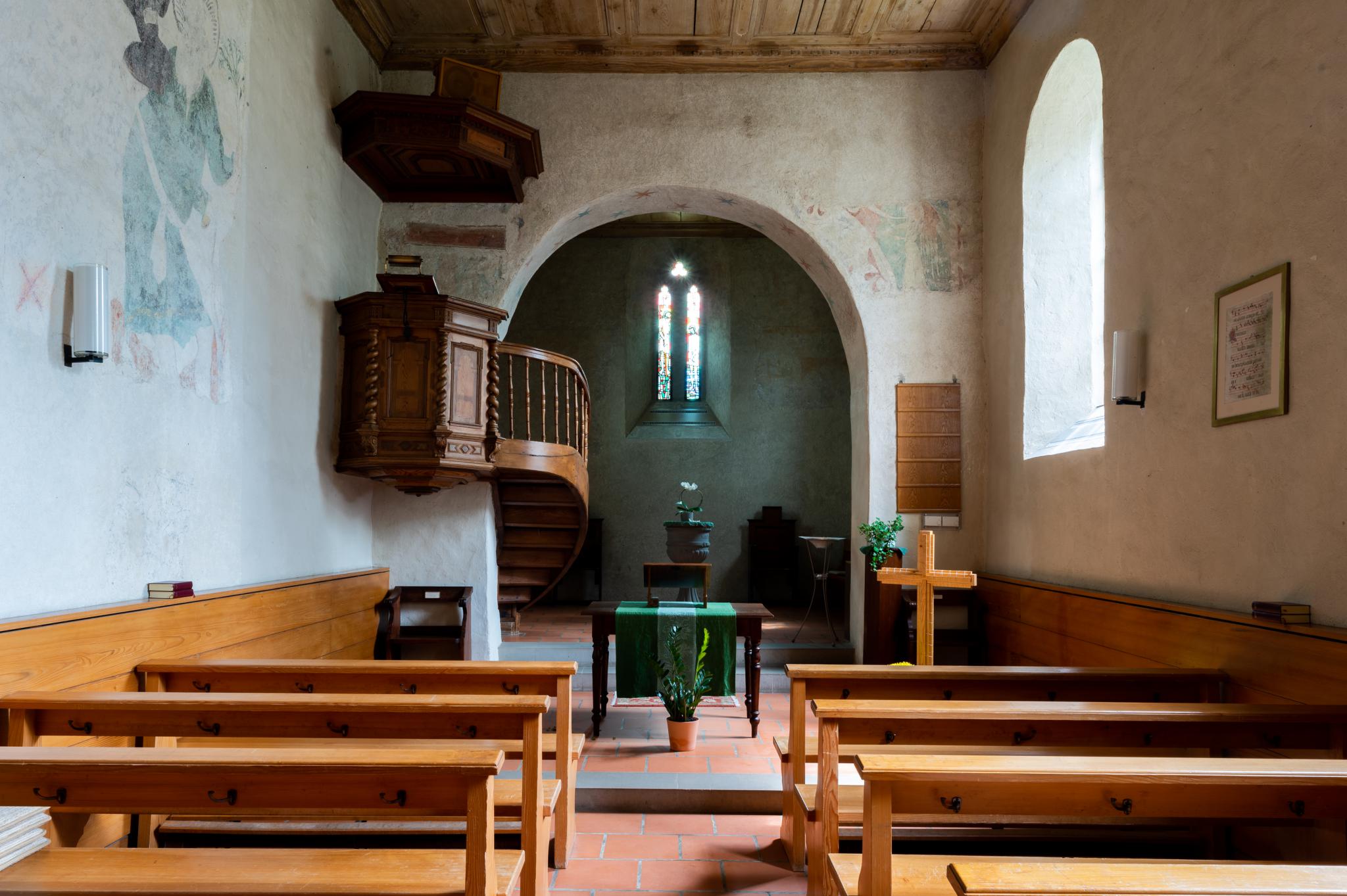 Im Chorfenster Glasgemälde Albert Saners von 1961.