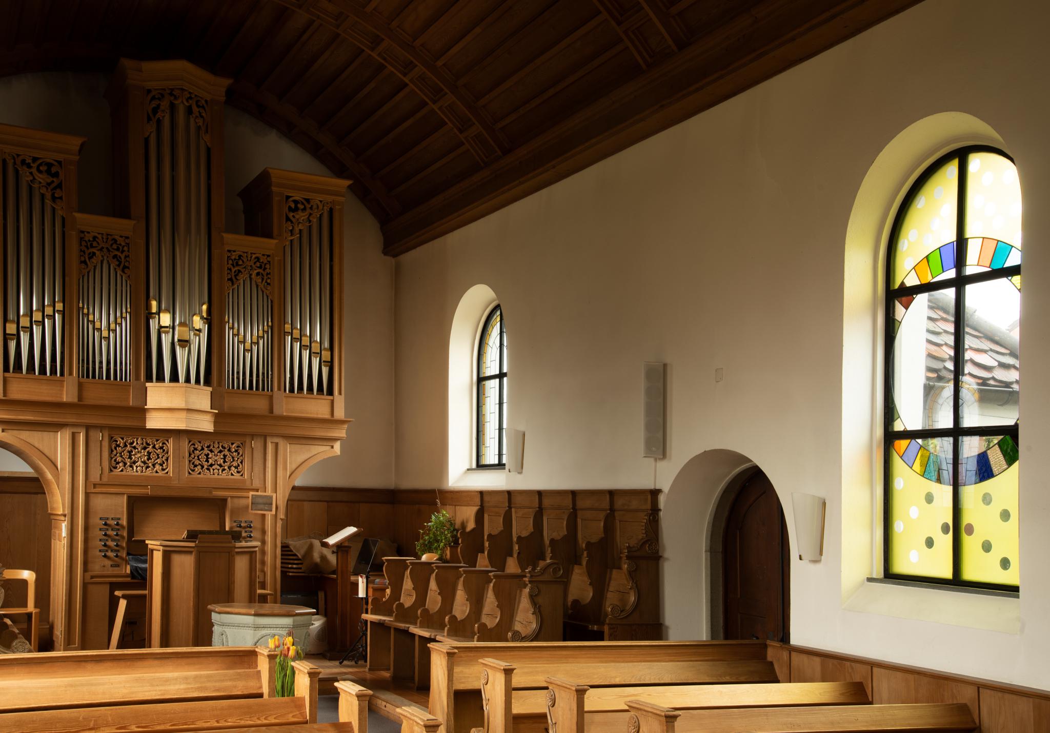Vermutlich gotischer Kernbau, 1752, 1808, 1923 und 1951 stark verändert; renoviert 1997. Hallenbau mit spitzhelmigem Dachreiter. Glasgemälde 1998 von Ute Klein.