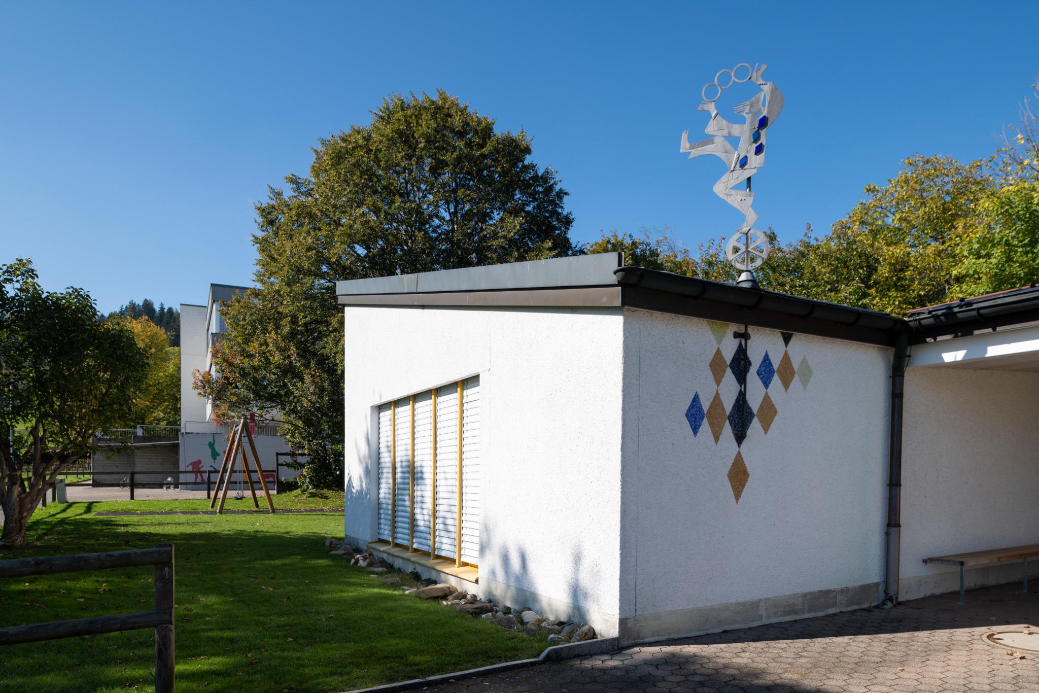 1971 wurde der Doppelkindergarten mit Abwartwohnung als Teil der Erweiterung der Schulanlage Ebnet in Abtwil fertiggestellt. Projektiert und ausgeführt wurde der Bau von dem Abtwiler Architekten Hans Stevanon. Am 14. September 1971 fand die Einweihung mit einem Kinderfest statt. Eine Metallskulptur mit Dallglas und eine Wandmalerei des in Engelburg ansässigen Glasmalers und Künstlers Heinrich Stäubli ziert den Eingangsbereich (HS_1044).