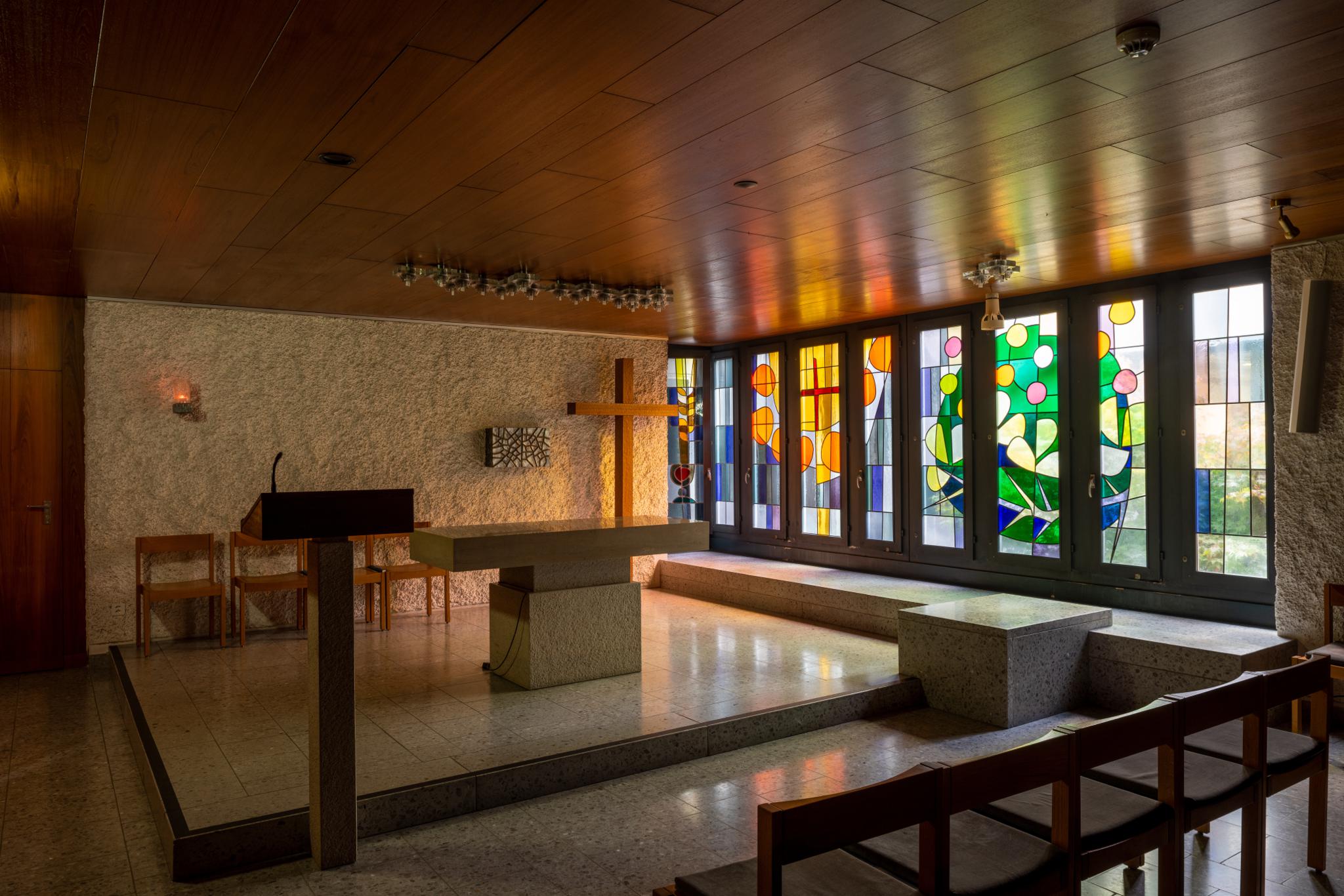 Das Kantonsspital in Wil wurde 1970 nach den Plänen des Planungs- und Architekturbüros Glaus und Stadlin (1954–1993, St. Gallen) errichtet, das von Otto Glaus (1914–1996), einem wichtigen Vertreter einer skulpturalen Schweizer Sichtbetonarchitektur geleitet wurde. Die Kapelle im Untergeschoss wurde mit einer bauzeitlichen raumgreifenden Glasmalerei von Heinrich Stäubli ausgestattet (HS_1059).