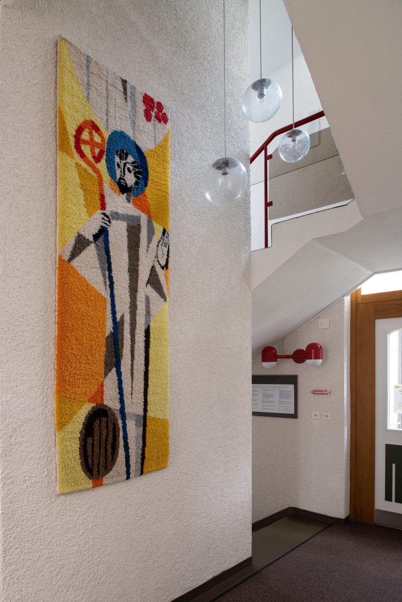 Im Foyer des katholischen Pfarramts hängt ein Wandteppich des Heiligen Otmar, der 1983 anlässlich des 75-jährigen Jubiläums der Pfarrei St. Otmar von der Vereinsmitgliedern der Frauengemeinschaft nach dem Entwurf von Heinrich Stäubli geknüpft wurde.