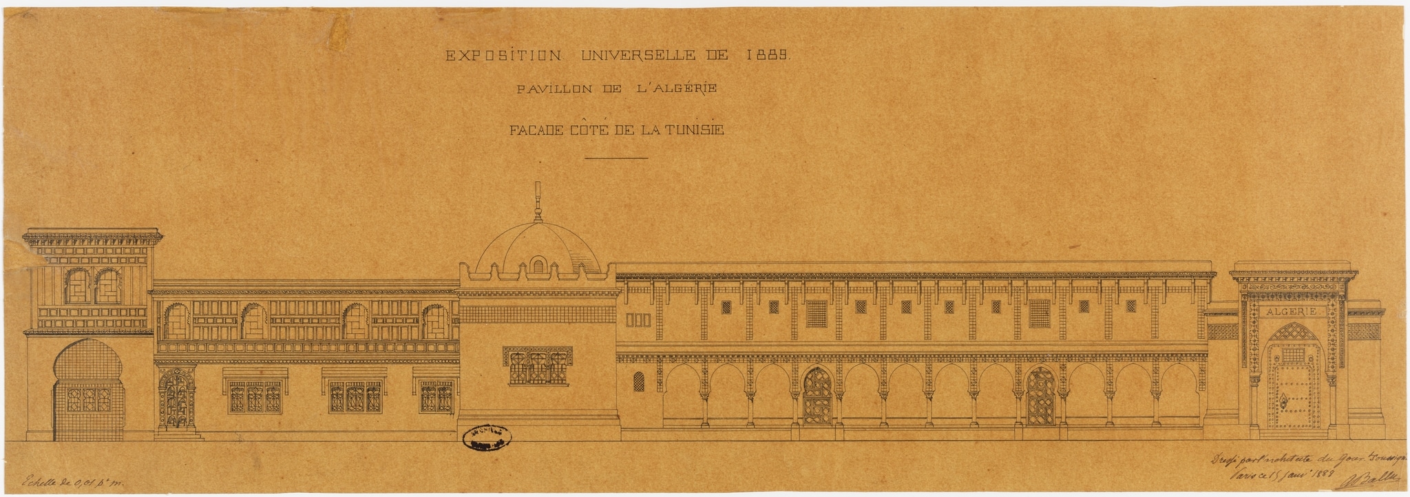 The Algerian pavilion at the 1889 Paris fair was designed by two former colonial civil servants, Albert Ballu, who had lived in Algeria for five years, and Émile Marquette, inspector of monuments in the diocese of Algiers. The building brought together elements of Algerian architecture dating to different periods. It was an introverted structure, with courtyards, and plain exterior facades with arched portals and porticoes. The square minaret, topped with a French flag, as well as the dome of the main hall were modelled after the 12th-century Mosque of Sidi Abd al-Rahman. Some of the faience and mosaics were inspired by the 16th-century Djamaʿa el-Djedid. The staircase and exit door on the south side replicated those of the Algiers Museum (17th century). The entrance porch was inspired by the tomb of the last Bey of Algiers (d.1838) (Çelik, 1992, p. 128, fig. 87; Tran, 2004, p. 41). Édouard Didron made the stained-glass windows of the pavilion in an orientalizing style. An elevation on one of the façades, made by Ballu in January 1888, shows eleven of these windows arranged in groups of three (Archives nationales de France, F/12/4055/B (3)/Algérie façade, c. 58 x 20 cm).