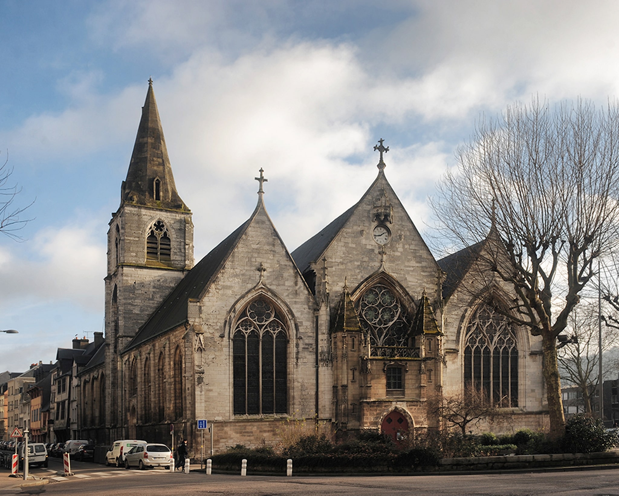 In der Kirche sind wenige Resten von Glasmalereien aus dem späten 15. Jh. erhalten (siehe bspw. Rose im Osten, verdeckt durch Gewölbe des 19. Jh.). Ins 19. Jh. datieren acht Fenster aus dem Atelier Gsell-Laurent, Paris (ca. 1865–1875), die der Jungfrau Maria und einzelnen Heiligen gewidmet sind, sowie drei Fenster von Gustave Moïse, Rouen (1875) und Jules Boulanger, Rouen (1893), die das Leben von Christus und Maria sowie von Johannes dem Täufer und dem heiligen Vivianus zeigen. Vier weitere Fenster mit Heiligendarstellungen der Ateliers Gsell-Laurent und Boulanger, die 1881 im nördlichen Seitenschiff eingesetzt und zu Beginn des 2. Weltkriegs eingelagert wurden, sind heute nicht mehr erhalten (Chaline, 1998, 20).