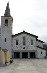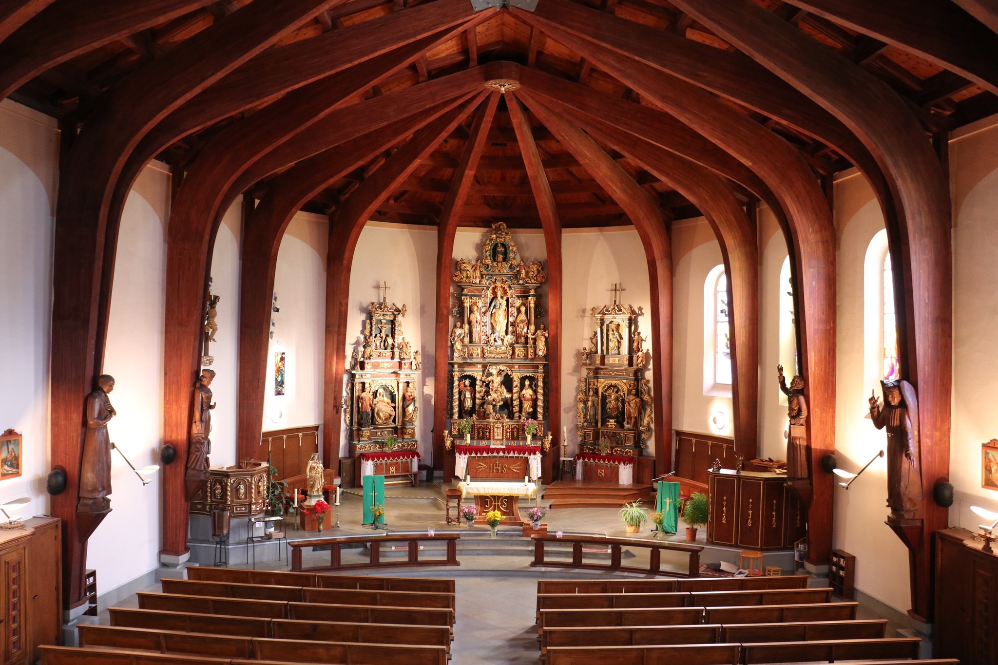 La paroisse fait appel aux architectes Fernand Dumas et Denis Honegger pour l’élaboration des plans. Elle établit un programme à leur attention, précisant différents points autant d’ordre architectural et décoratif que spirituel. La capacité de l’église devant être de 650 places assises, elle précise que la tour et l’autel de l’ancienne église doivent être conservés (sur conseil de Praz, mais finalement seulement certaines parties seront maintenues). Elle souhaite aussi l’intégration d’un porche, d’un baptistère et d’une tribune, ainsi que des dépendances et une cure. Des vitraux sont également inclus à ce programme ("Programme pour l’orientation des architectes [...]", s.d.). En mai 1947, les plans sont approuvés par la Commission cantonale des constructions (Anthamatten, 1947). L’ancienne église est démolie en 1949 et le nouvel édifice consacré le 12 août 1951. Sur un plan semi-elliptique, "une impressionnante ossature d’arcs croisés en bois d’arolle scande l’espace intérieur en délimitant cinq travées de nef et l’espace du chœur. Cette structure est autoportante" (Raemy-Berthod, 1997, p. 51). La lumière est distribuée par des ouvertures situées seulement au sud et sur la façade occidentale.