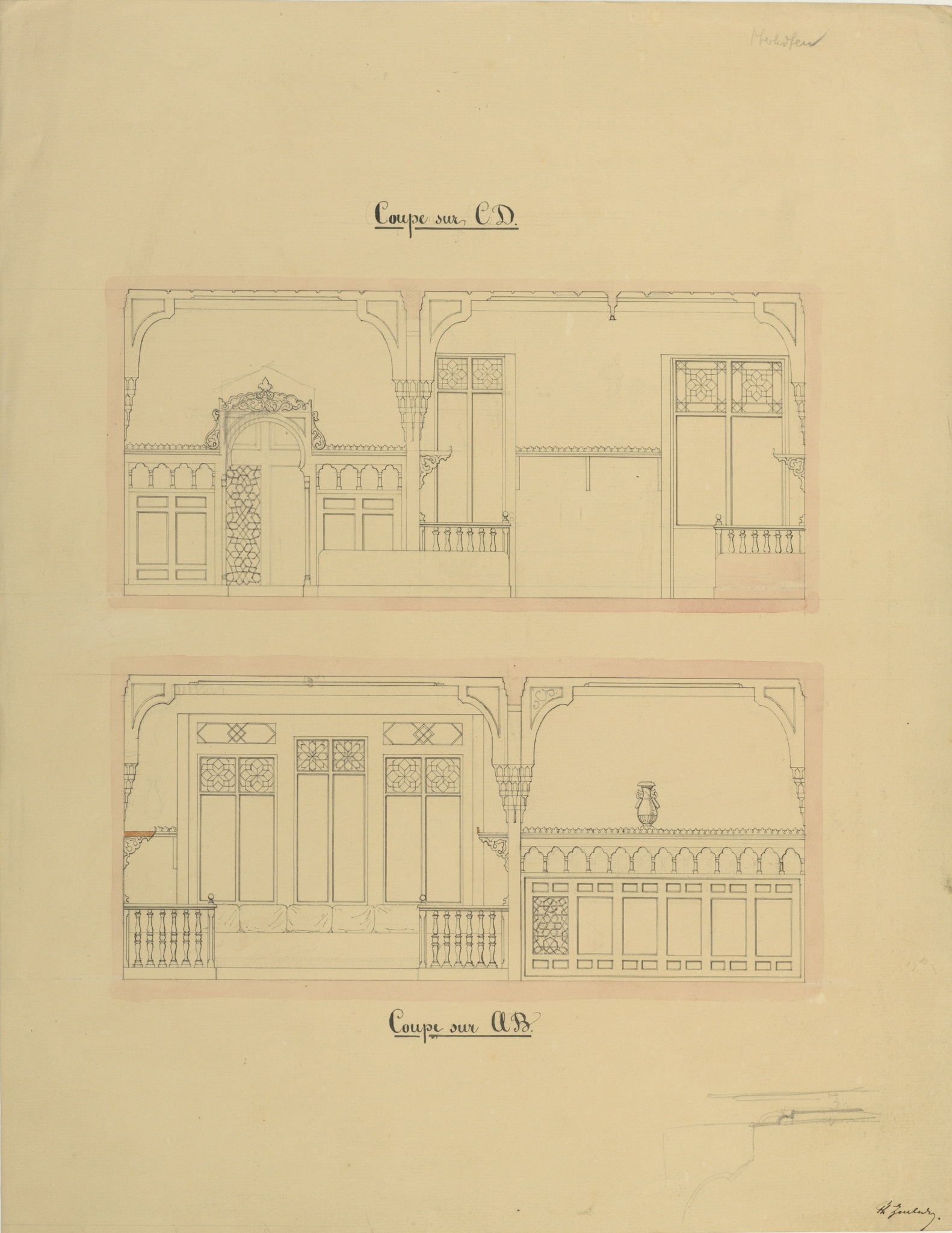 The drawing is held in the Burgerbibliothek Bern and has the reference number Gr.B.322. Title of the drawing in the catalogue of the Burgerbibliothek Bern: Schloss, türkischer Rauchsalon, Projekt, Längs- und Querschnitt