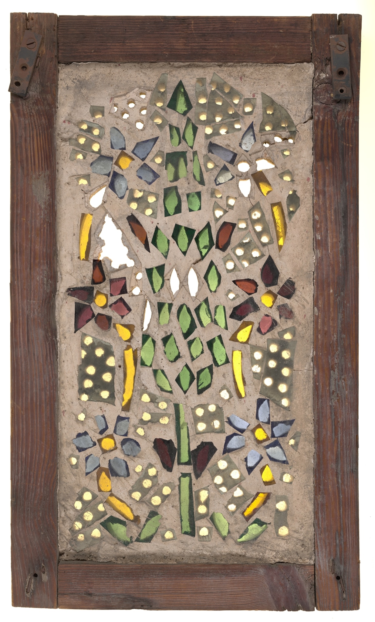 IG_260: Stucco and glass window with cypress tree and flowers, verso