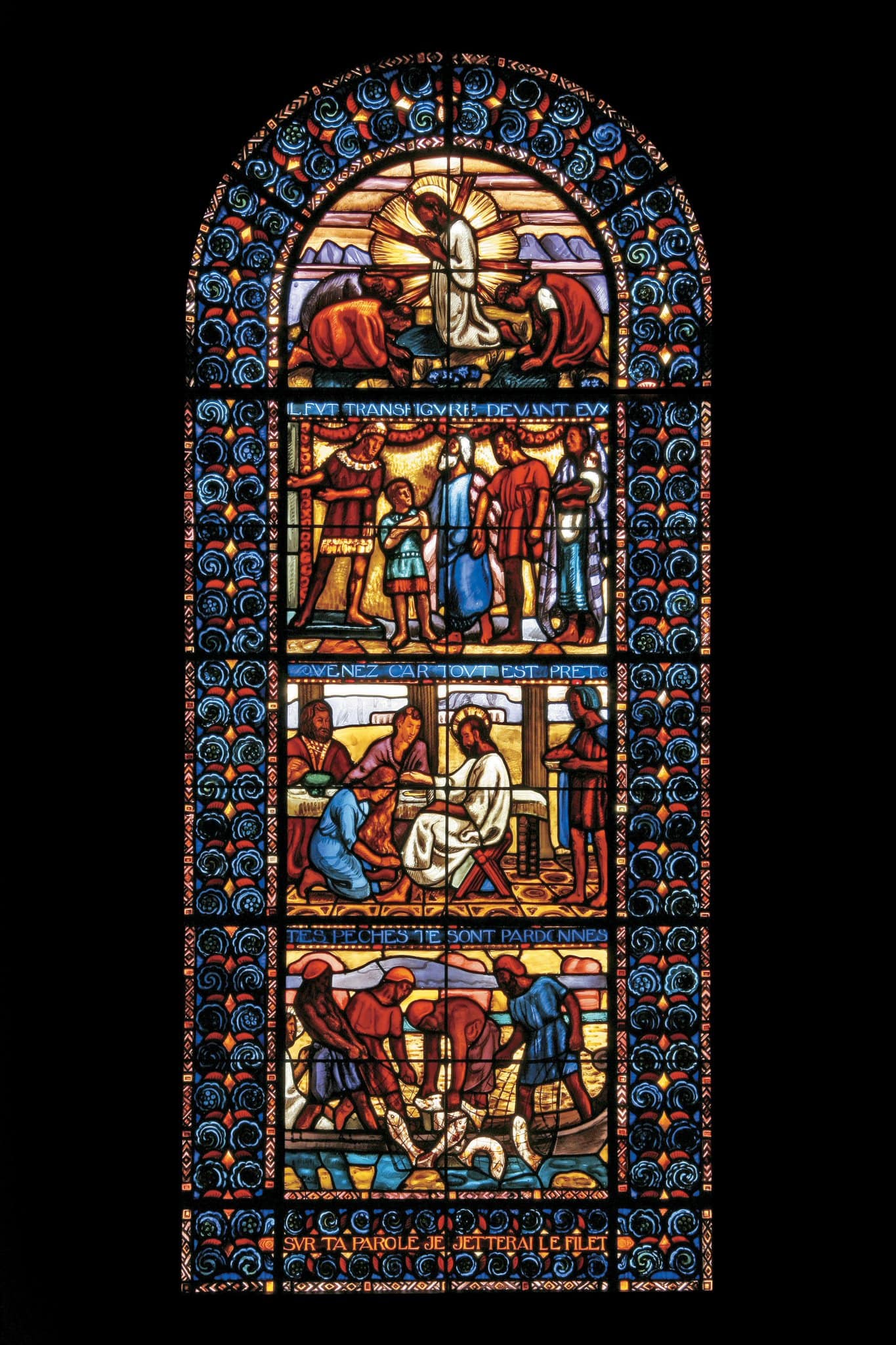 Le Christ transfiguré est entouré de trois apôtres agenouillés à ses pieds. Un serviteur invite, sur les ordres de son maître, des pauvres et un infirme au repas. Jésus assis à une table avec les apôtres se fait laver les pieds par Marie-Madeleine. Quatre pêcheurs tirent les filets remplis de poissons, sous le regard du Christ.