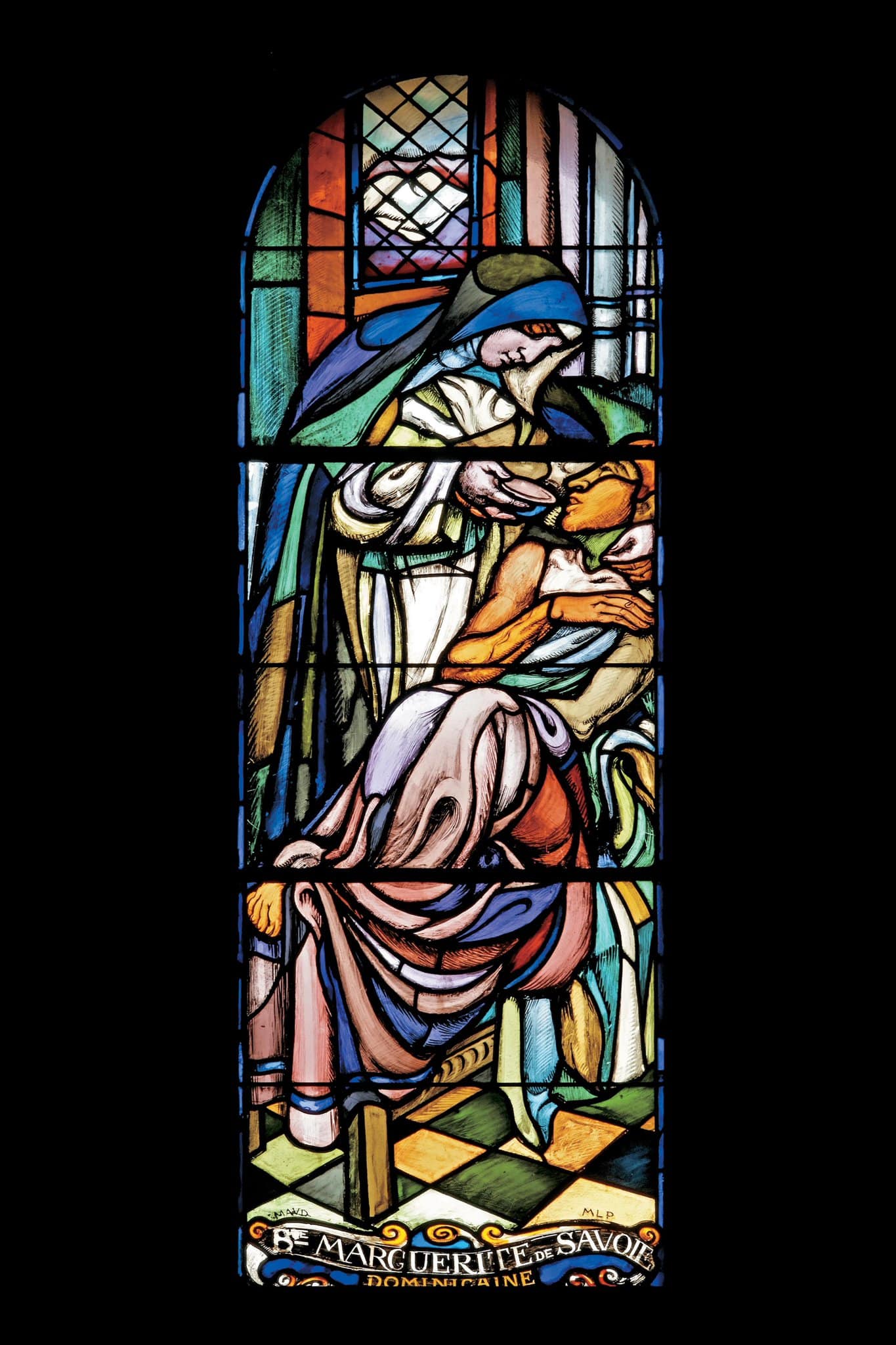 Marguerite de Savoie devient veuve de Théodore, marquis de Montferrat, en 1415. Alors que le duc de Milan souhaite l’épouser, elle préfère se tourner vers la piété et entre dans le Tiers-Ordre dominicain puis devient sœur dominicaine sous la règle de saint Augustin. Elle devient responsable de l'hôpital Santa Maria degli Angeli et y soigne les malades, comme l’illustre ce vitrail (“Les nouvelles œuvres de Maurice Denis […]”, 1923).