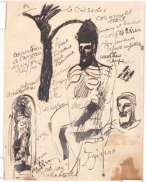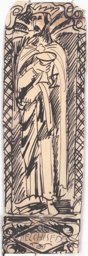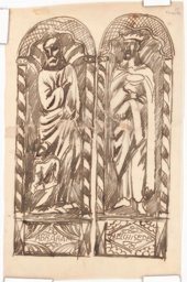 En ce qui concerne les travaux préparatoires, il s’agit majoritairement d’esquisses, qui rendent compte de l’étude poussée que l’artiste mène pour établir l’attitude, l’expression et même la psychologie des figures qu’il souhaite représenter. Plusieurs croquis sont accompagnés de petites notes brossant à grands traits le caractère des personnages : Moïse « yeux noirs perçants, tête de bélier » (MP_01.53), Melchisedech « yeux fendus, figure mystérieuse » (MP_01.62). Ces inscriptions rendent également compte des sources visuelles et culturelles dans lesquelles Poncet puise son inspiration : les ballets russes, des textes de Shakespeare, Don Quichotte. Grand admirateur de Rembrandt, il est aussi possible que Poncet se soit inspiré des estampes de l’artiste sur le thème du Sacrifice d’Isaac pour ses premières esquisses du vitrail d’Abraham (MP_01.51 ; MP_01.55). L’art médiéval constitue une autre grande source de ce cycle, et plus précisément des modèles issus de la sculpture monumentale chartraine. Dans une page de note de sa main liée au cycle des vitraux de la tribune des orgues, Poncet évoque le porche septentrional de Chartres où sont représentés, entre autres, Melchisedech, Abraham, Moise, et David (Poncet, [1924]). Il place ses figures au sein d’un encadrement architectural qui évoque la niche dans laquelle sont placées les statues, de même que le soubassement sur lequel elles reposent. Il leur confère un aspect hiératique et les soumet à une certaine déformation, notamment la partie basse du corps de David, tandis que le traitement en camaïeu avec de forts clairs-obscurs crée un effet de modelé qui évoque la pierre et la sculpture, bien que l’artiste ne cherche pas à créer un trompe-l’œil, ni à estomper l’aspect bidimensionnel de l’ensemble (Noverraz, 2014, p. 43-44).