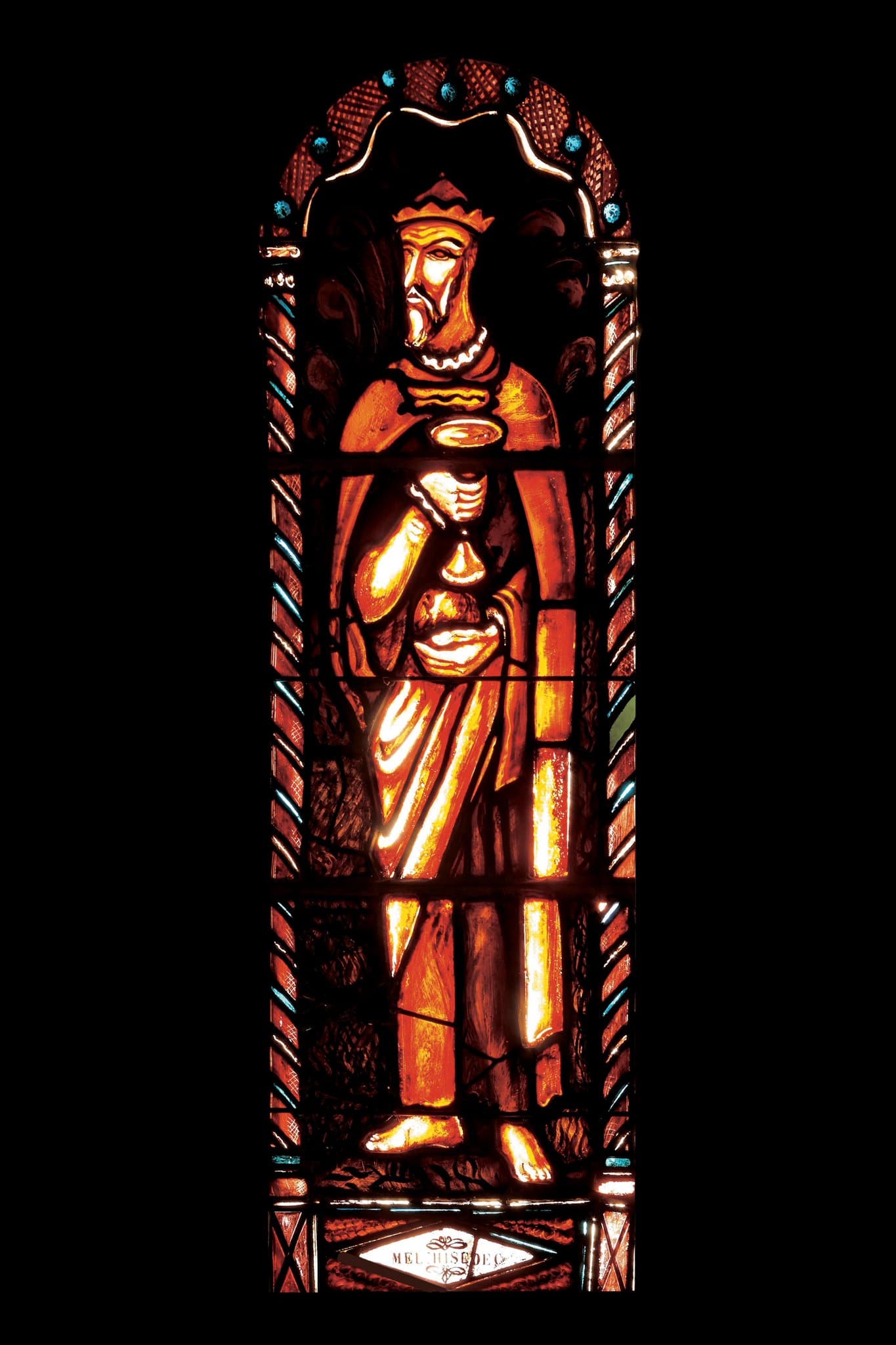 Ce vitrail a été réalisé en 1924 par l’artiste Marcel Poncet dans la tribune des orgues de l’église Saint-Paul de Cologny (GE), dans le quartier de Grange-Canal. Il fait partie d’un ensemble de trois vitraux placés côte à côte, consacrés à David, Moïse et Melchisedech.