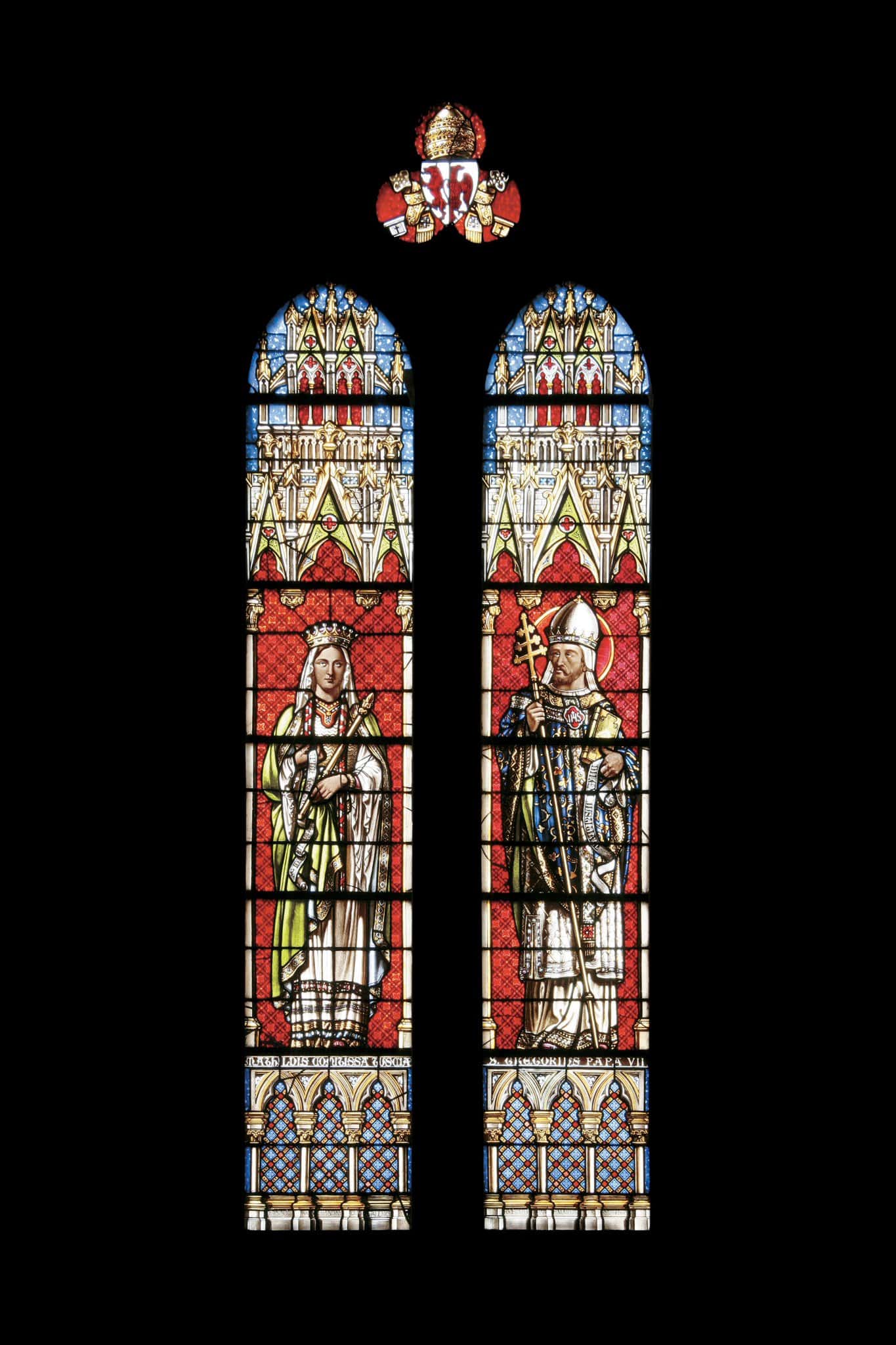 Sur la lancette de gauche, la comtesse Mathilde, couronnée, tient le sceptre. Sur la lancette de droite, saint Grégoire porte un livre et la crosse.