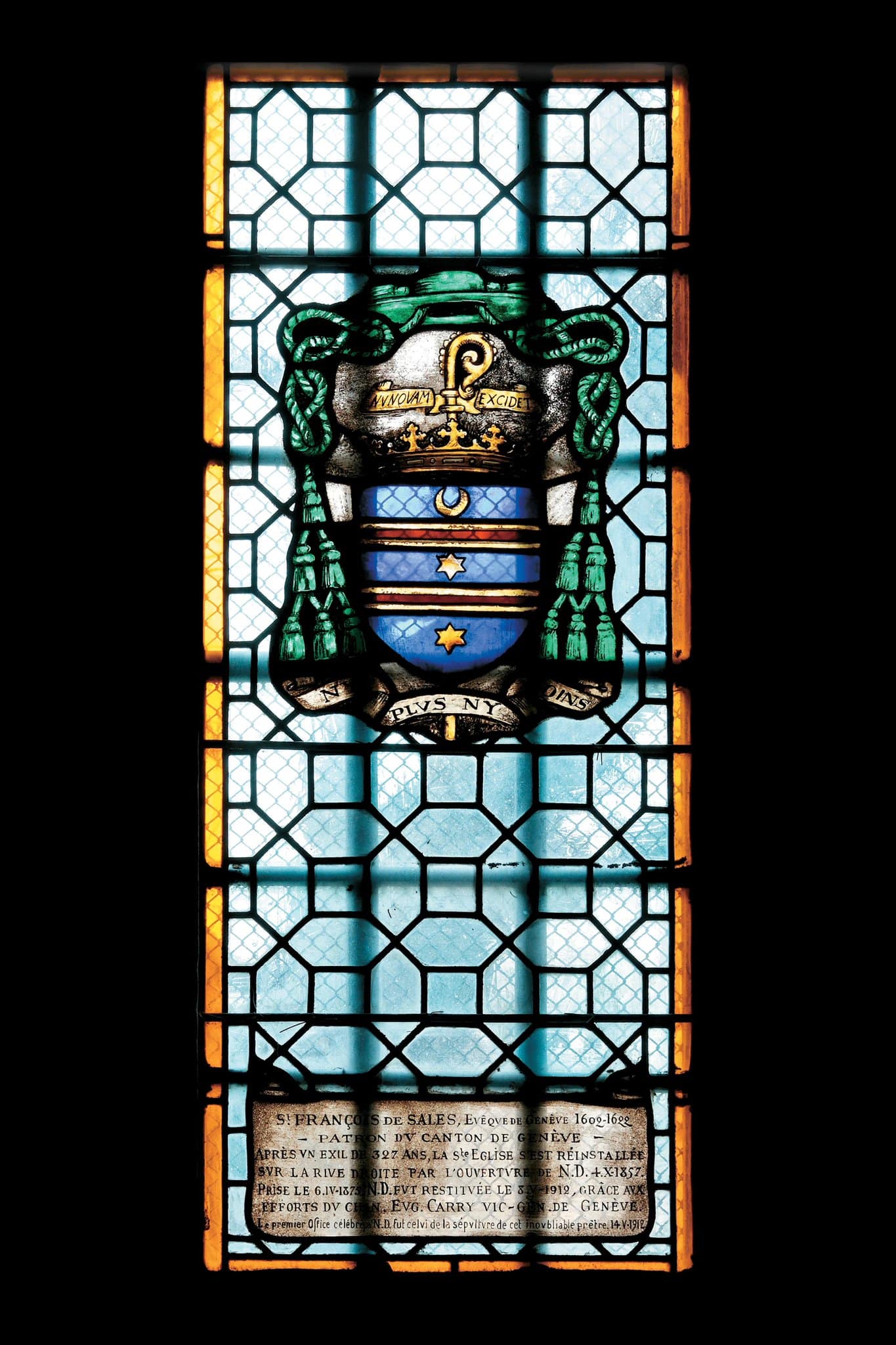 NVNOVAM EXIDET (dans les armoiries) / NY / PLVS NY / MOINS (sous les armoiries) / ST. FRANCOIS DE SALES, EVÊQUE DE GENEVE 1602-1622 / – PATRON DU CANTON DE GENEVE – / APRES UN EXIL DE 327 ANS, LA Ste EGLISE S’EST REINSTALLEE / SUR LA RIVE DROITE PAR L’OVVERTURE DE N.D. 4.X-1857. / PRISE LE 6.VI-1875, N.D. FVT RESTITUEE LE 8.V-1912, GRACE AUX / EFFORTS DU CHAN. EVG. CARRY VIC-GEN. DE GENEVE. / Le premier Office célébré à N.D. fut celui de la sépulture de cet inoubliable prêtre 14.V-1912 (cartouche)