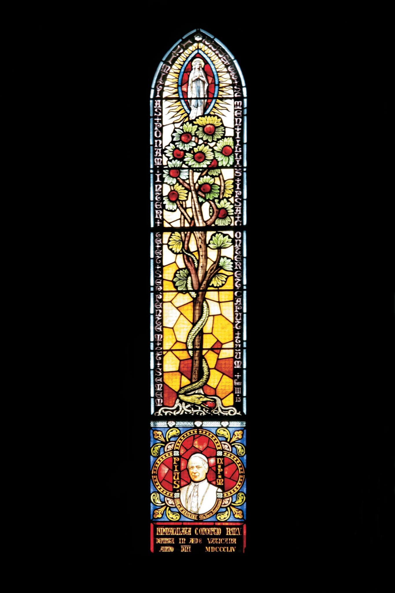 L’arbre du jardin d’Eden se déploie au centre avec le serpent sur son tronc, signifiant la chute originelle. Au-dessus, la Vierge en prière dans une mandorle. En bas, le portrait du Pape Pie IX