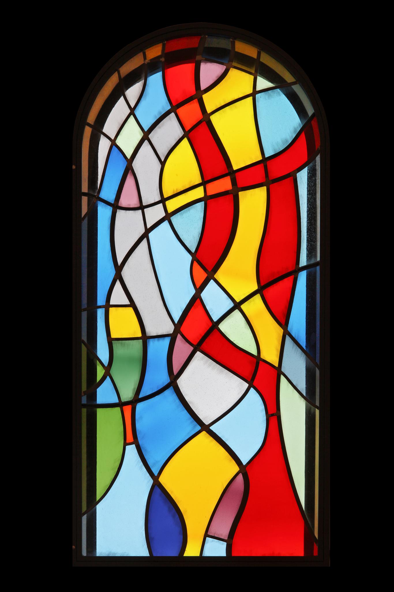 Vitrail abstrait composé de verres colorés rouges, oranges, jaunes, verts, bleus, roses et blancs symbolisant le peuple de Dieu, l’humanité et les membres de l’Eglise. Les lignes verticales et horizontales expriment à travers leurs ondulations un langage d’intense émotion : l’unification du peuple de Dieu créé à son image.