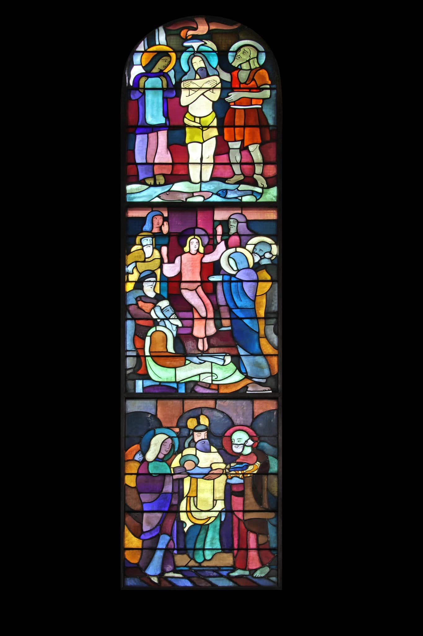 En haut le Christ, debout dans les eaux du Jourdain, est baptisé par Jean, alors que la colombe du Saint-Esprit descend sur lui. Un ange est à sa droite. Jésus assis au milieu des docteurs leur parle. A droite, Marie et Joseph viennent le retrouver. En bas, Marie et Joseph présentent Jésus à Syméon qui est au centre.