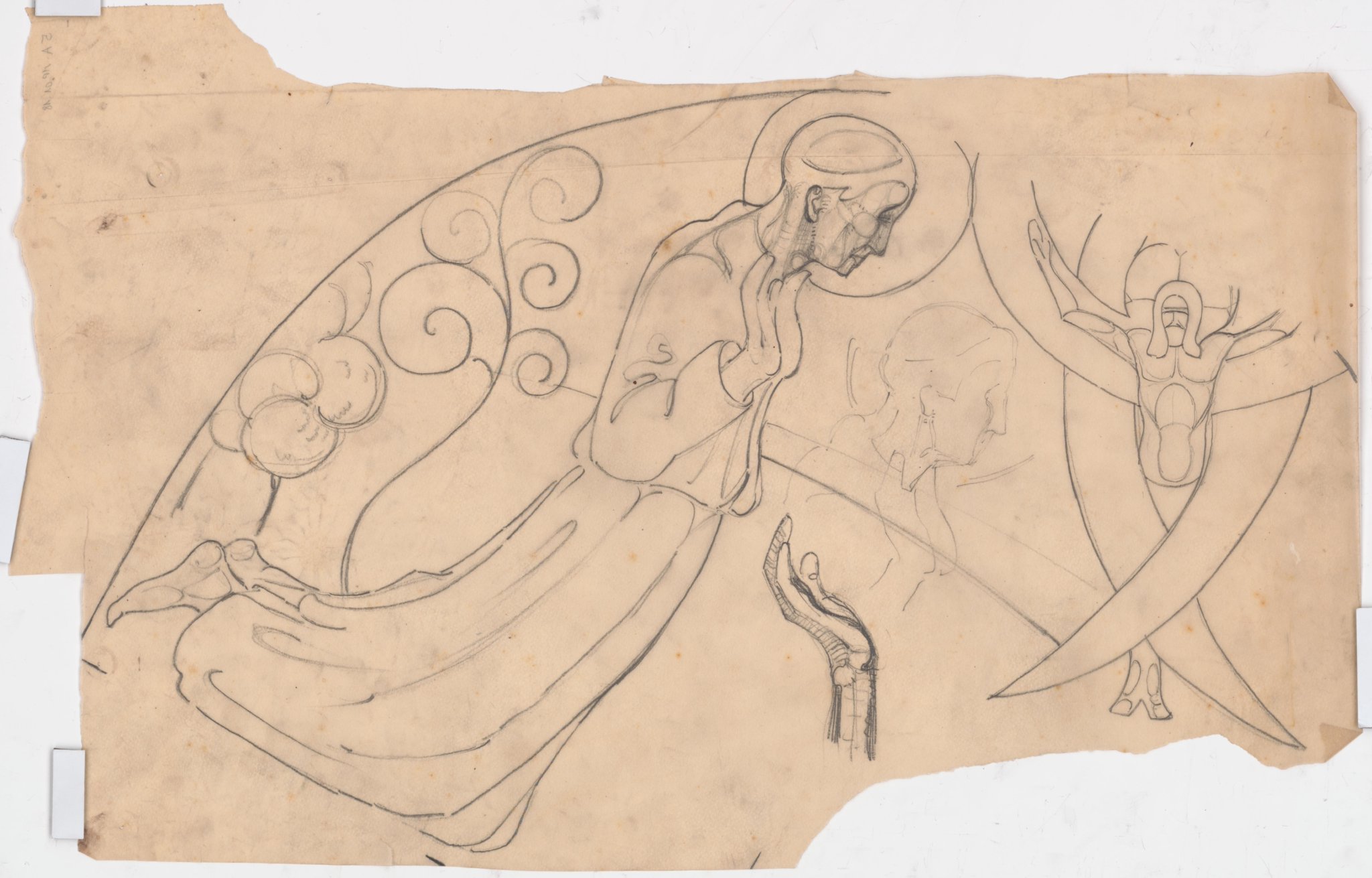 Trois oeuvres graphiques peuvent être reliées à la scène supérieure du vitrail (MP_01.17 ; MP_01.18 ; MP_01.19). Sur celle-ci, Poncet envisage différents éléments de sa composition, notamment le saint et le séraphin, montrant un aspect déjà proche du résultat final. Il devait probablement exister, comme pour les autres vitraux, des dessins antérieurs où les protagonistes étaient plus esquissés. Poncet dessine ici deux fois la tête du saint et étudie également l'anatomie de sa main, en dessinant la position de ses muscles et de ses articulations. Cette démarche manifeste le travail consciencieux d'un jeune artiste tout juste sorti des Beaux-Arts.