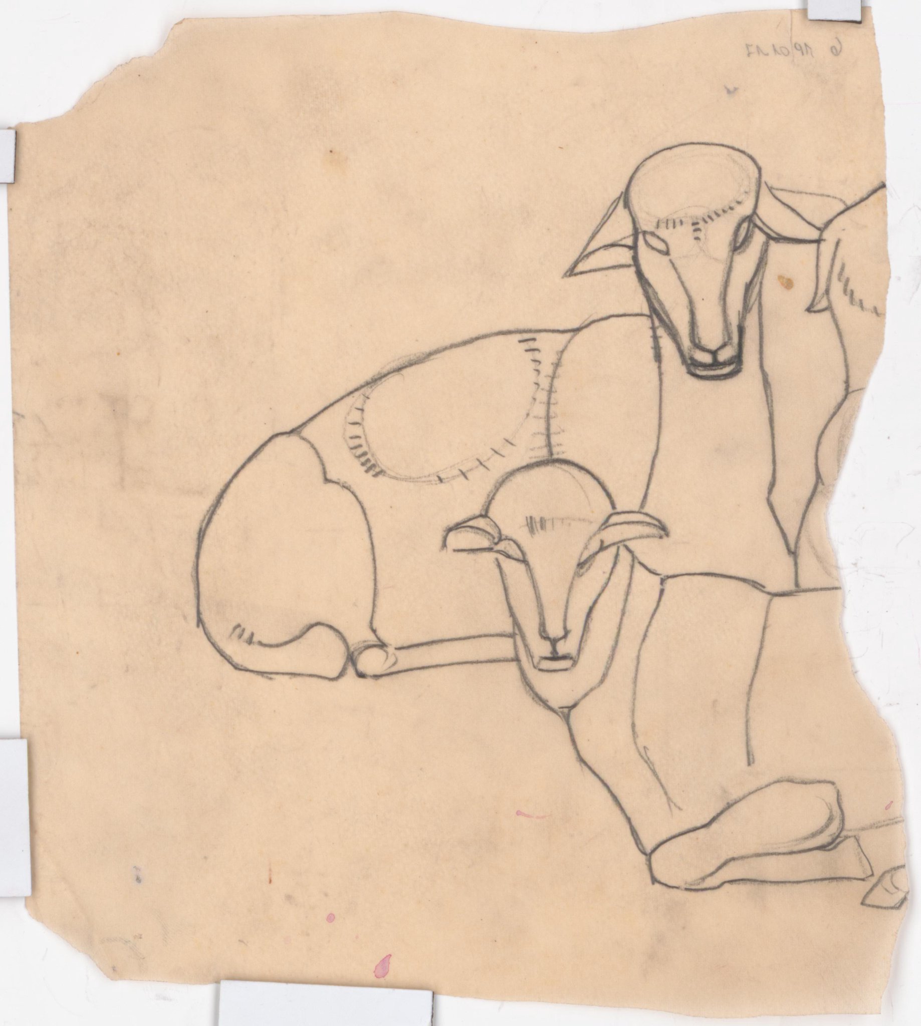 Esquisse avec deux moutons couchés l'un contre l'autre, la tête de face. Une partie de la tête d'un troisième mouton est visible à droite.