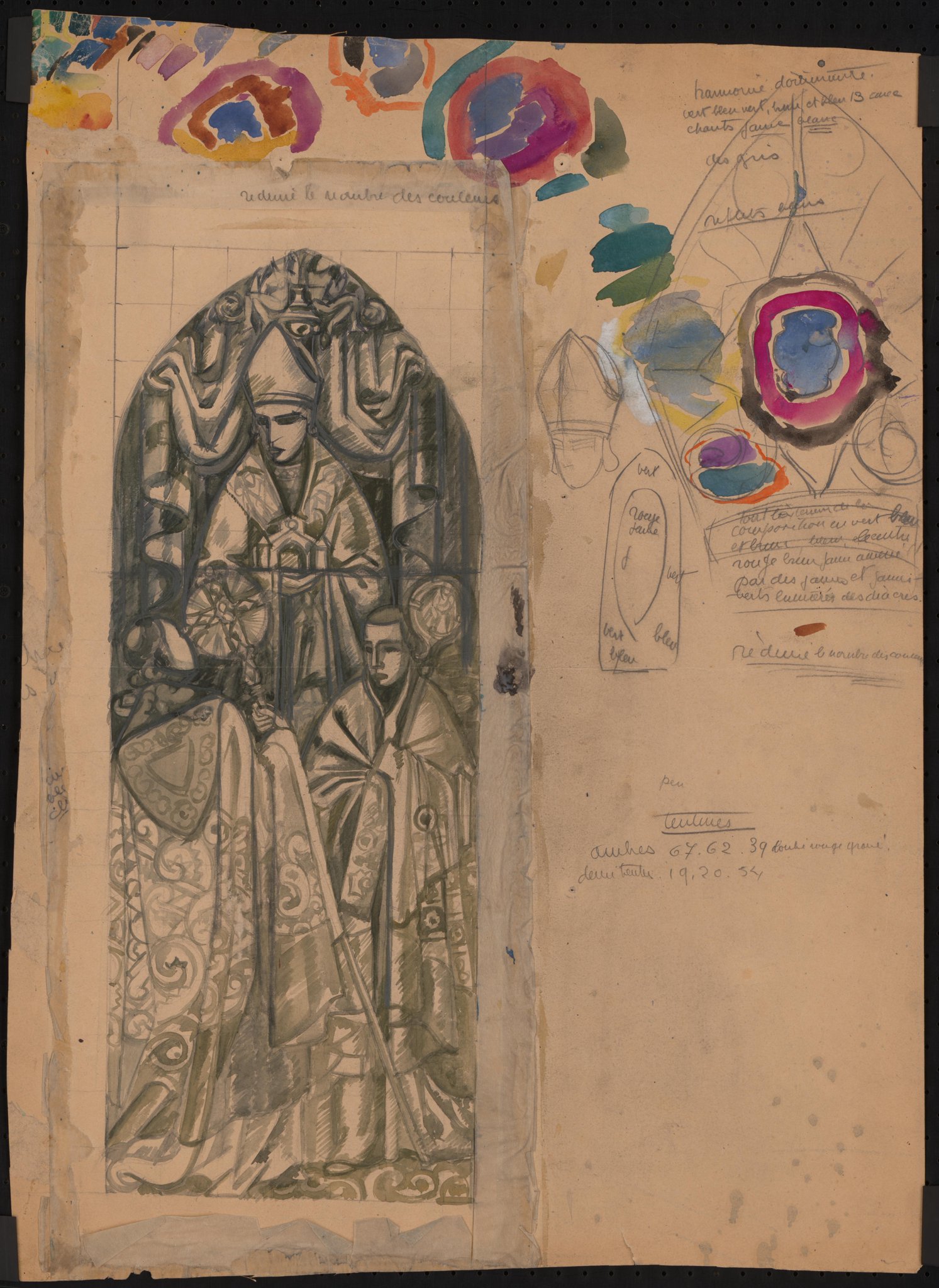 réduire le nombre des couleurs // harmonie dominante. / vert bleu vert, brun et bleu 13 avec / [chants] jaune blanc / des gris / reflets bleus / Dans la petite esquisse au crayon : vert / rouge / jaune / vert / vert // bleu / bleu // tout la [...] de la / composition en vert bleu / et brun, bleu, le centre / rouge brun jaune [...] / par des jaunes et jaunes / verts lumières des diacres. / réduire le nombre des couleurs / peu / tentures / ombres 67.62.39 [...] rouge gravé / demi [teinte]19.20.54