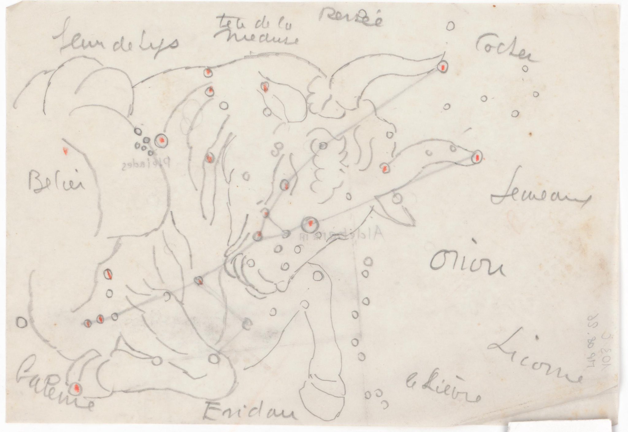 Étude pour des vitraux sur le thème de la "carte du ciel": le Taureau couché, en appui sur ses pattes avant. La figure suit le tracé des étoiles et des lignes de sa constellation (dessinées au crayon au verso).