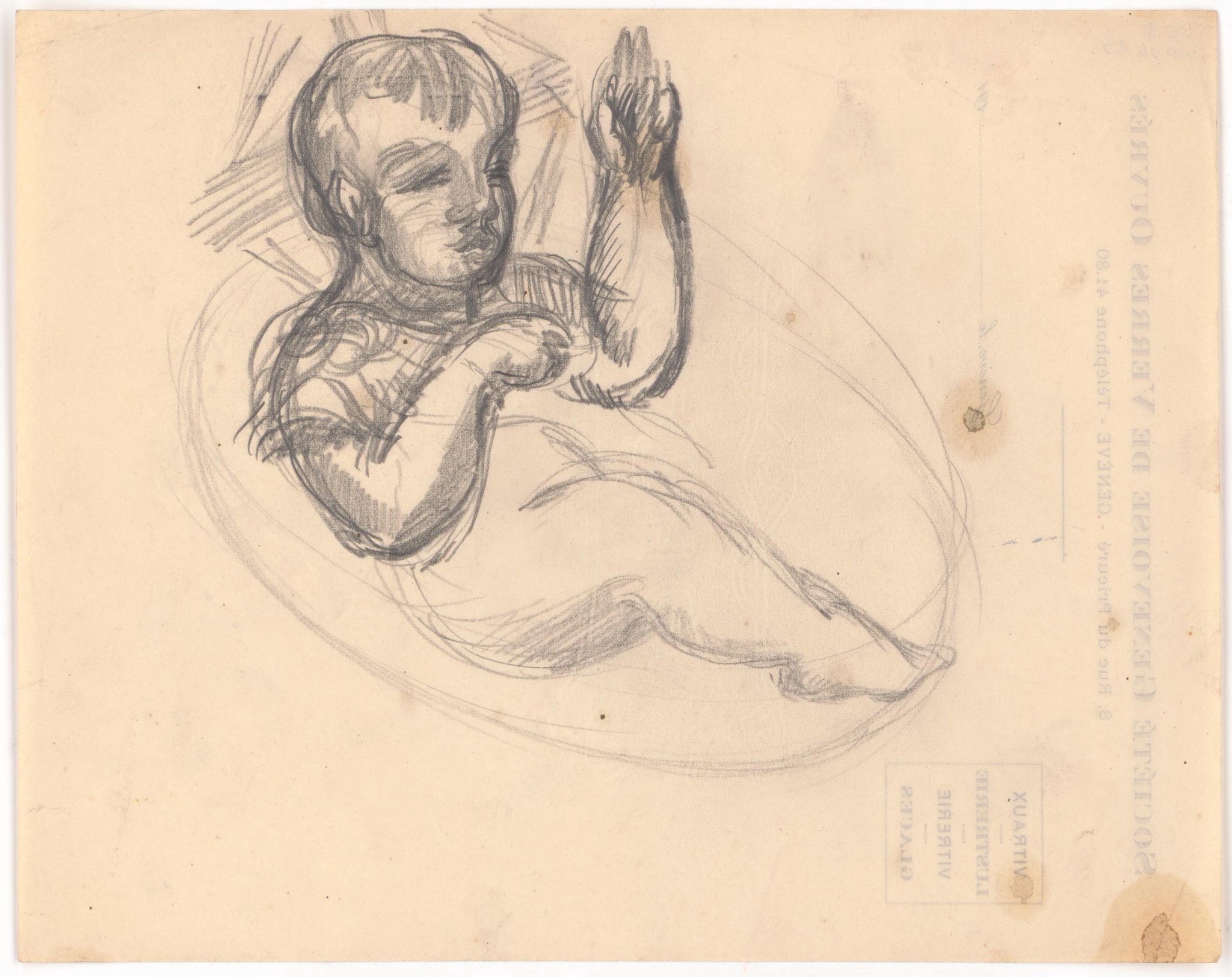 Le Christ enfant couché dans la crèche, à peine esquissée, bénissant de la main.