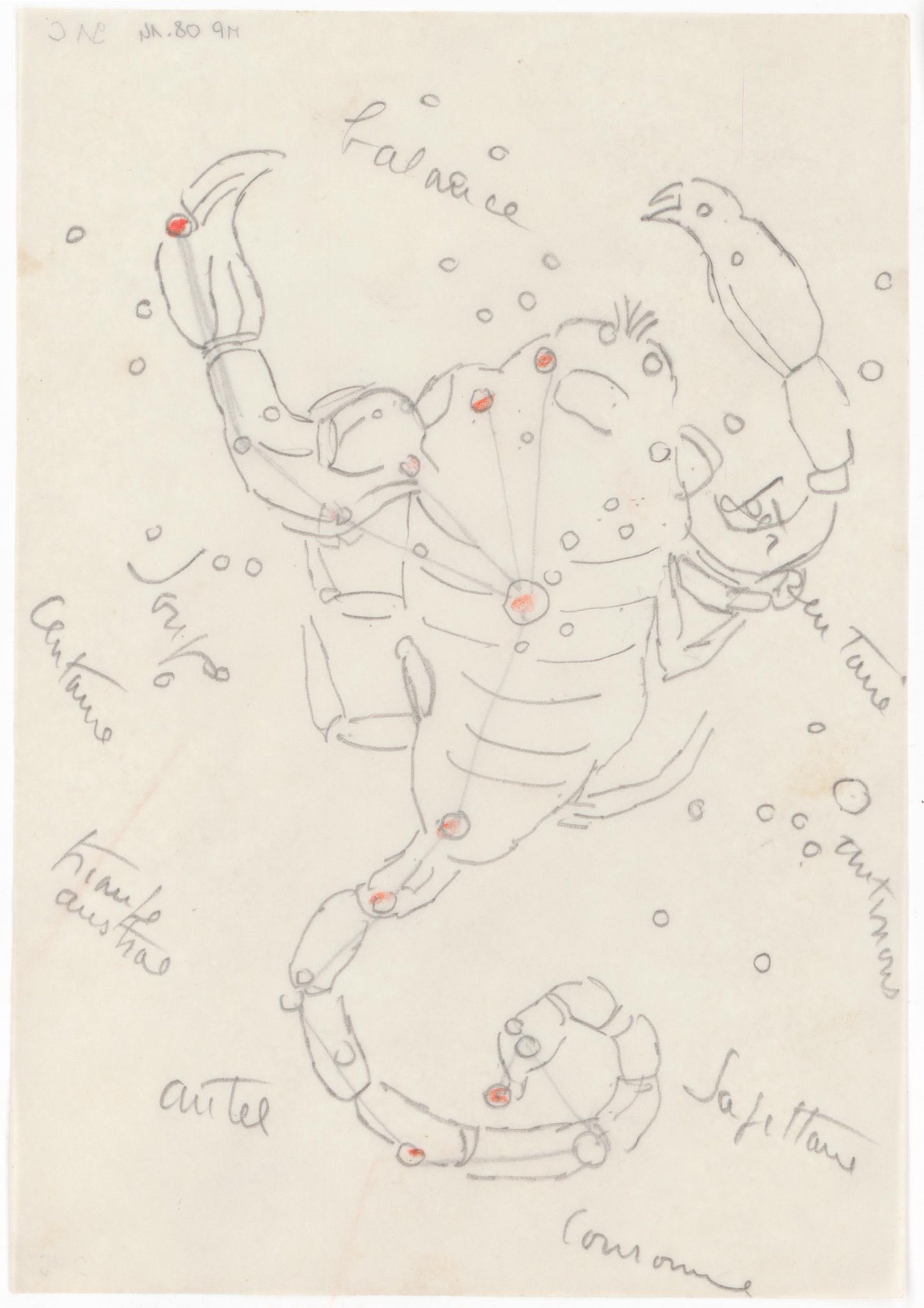 Étude pour des vitraux sur le thème de la "carte du ciel": le signe du Scorpion. La figure suit le tracé des étoiles et des lignes de sa constellation (dessinées au crayon au verso).