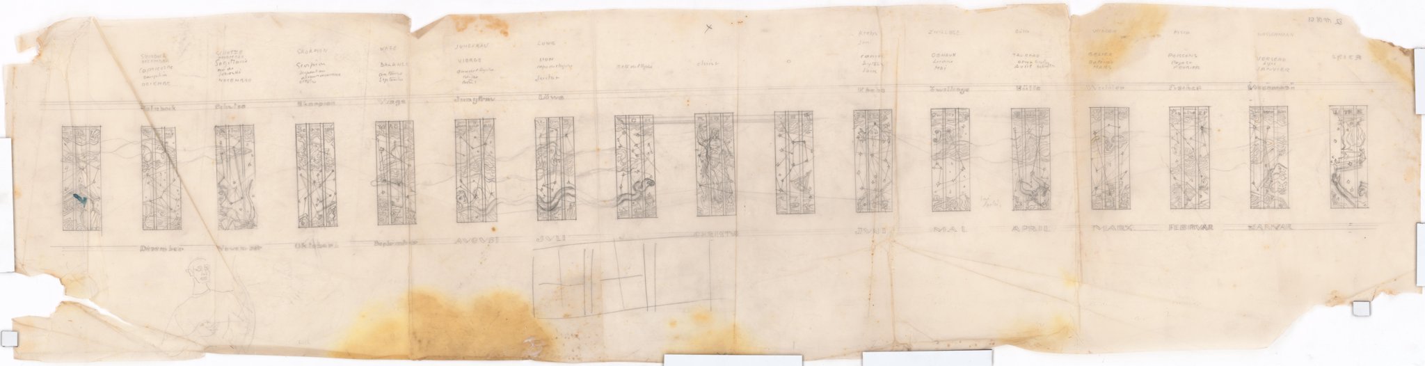 [De droite à gauche : en dessus et en dessous de chaque fenêtre :] LEIER // WASSERMAN / JANUAR // FISCHER / FEBRUAR // WIDDER / MARZ // BULLE / APRIL // ZWILLINGE / MAI // KREBS / JUNI // CHRISTUS // LOWE / JULI // JUNGFRAU / AUGUST // WAGE / SEPTEMBER // SKORPION / OKTOBER // SCHUTZE / NOVEMBER // STEINBOCK / DEZEMBER // 1937