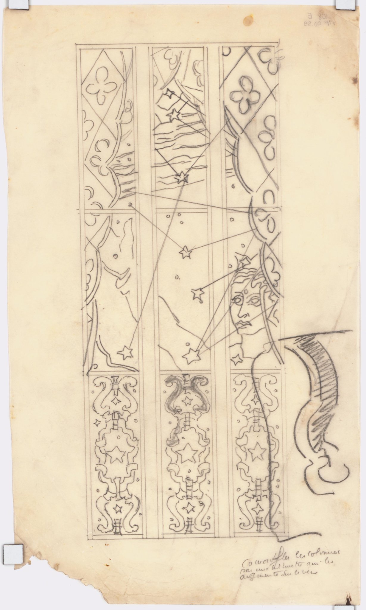 Projet de vitraux sur le thème de la "carte du ciel" : la constellation de la Lyre, représentée par un personnage couronné, le bras levé, sur fond de ciel étoilé. Le registre du bas est composé de motifs décoratifs en forme de lyres. A droite au crayon : petite esquisse de la forme d'une lyre.