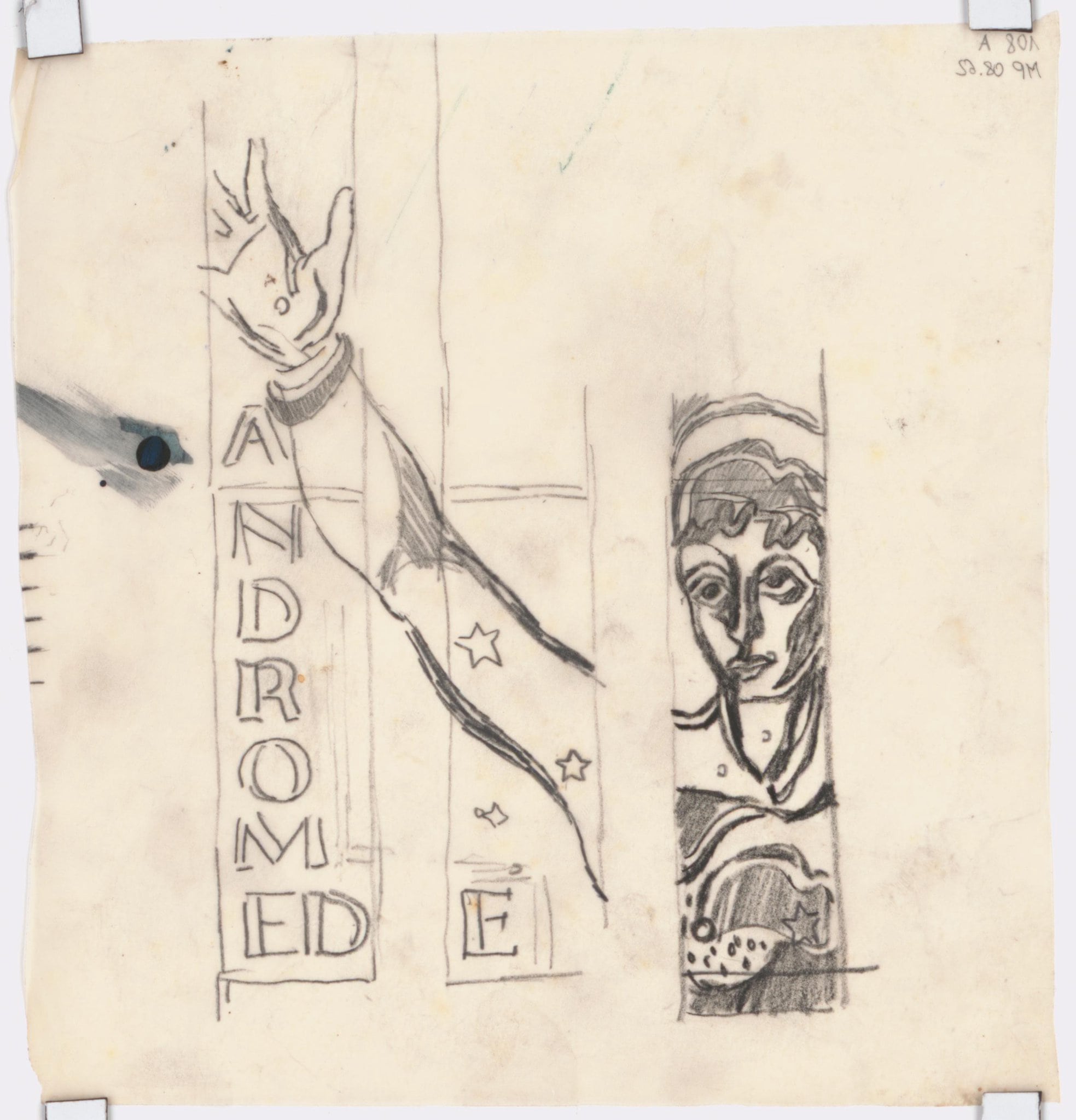 Esquisse pour des vitraux sur le thème de la "carte du ciel" : personnification de la Lyre le bras levé, entouré d'étoiles, pour le vitrail de la constellation de la Lyre.