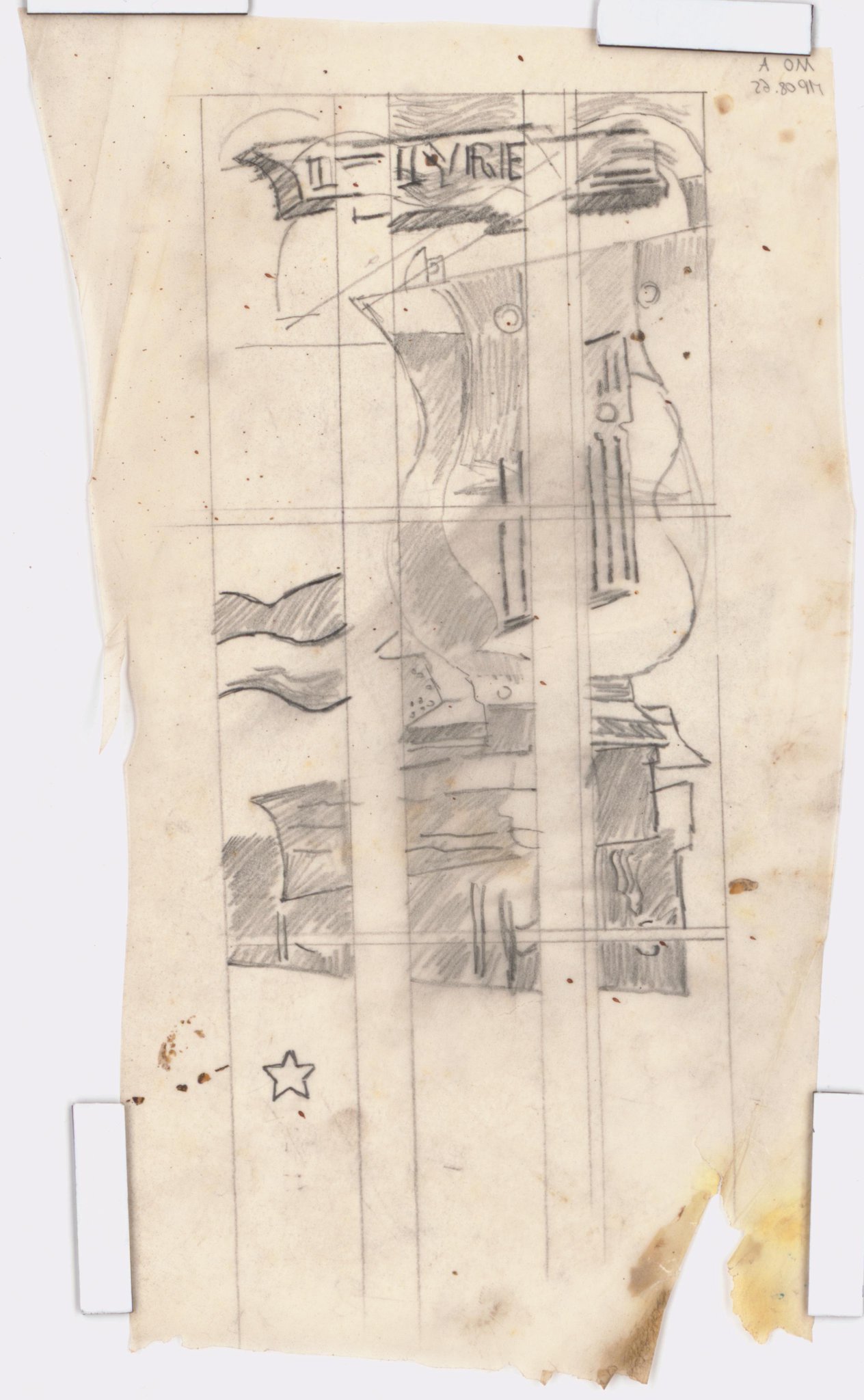 Esquisse pour des vitraux sur le thème de la "carte du ciel" : la lyre au sommet d'un amas rocheux, pour le vitrail de la constellation de la Lyre.