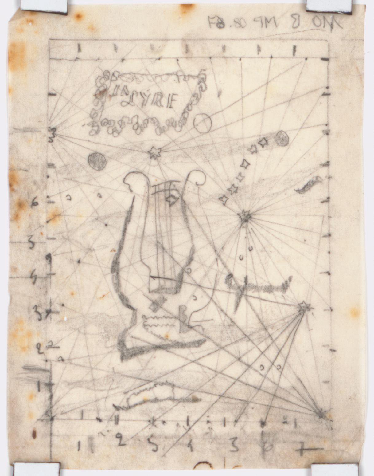 Esquisse pour des vitraux sur le thème de la "carte du ciel" : la lyre et les étoiles de la constellation de la Lyre, représentées dans un cadre gradué.