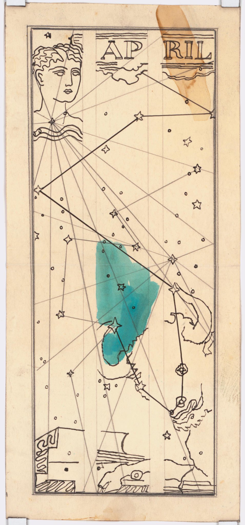 Projet pour des vitraux sur le thème de la "carte du ciel" : vitrail du mois d'avril et du signe du Taureau : en bas, la tête du Taureau qui suit le tracé de sa constellation, en haut, buste de personnage (personnification de la constellation de Persée ?). La composition est traversée par les tracés des constellations et des étoiles.