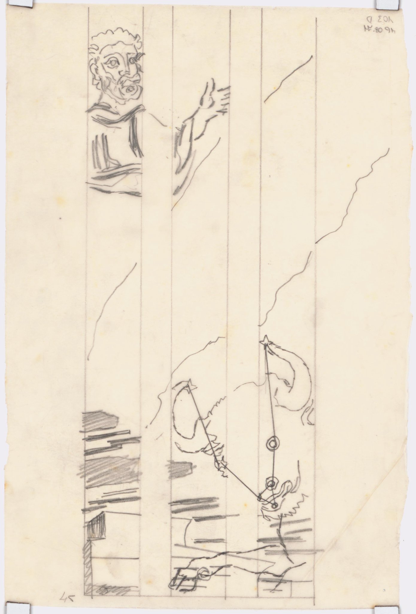 Esquisses pour des vitraux sur le thème de la "carte du ciel" : vitrail du mois d'avril et du signe du Taureau : en bas, la tête du Taureau qui suit le tracé de sa constellation, en haut, buste de personnage tendant la main (personnification de la constellation de Persée ?).