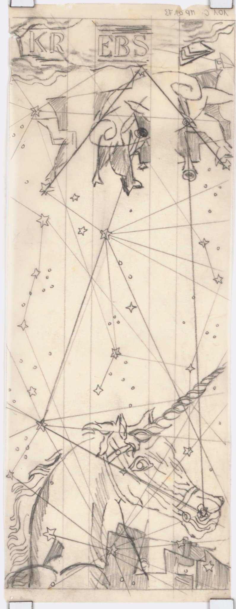 Projet pour des vitraux sur le thème de la "carte du ciel" : vitrail du mois de juin et du signe du Cancer. En bas, la licorne, pour la constellation du même nom. En haut, le Cancer au milieu de nuages. La composition est traversée par les tracés des constellations et des étoiles.