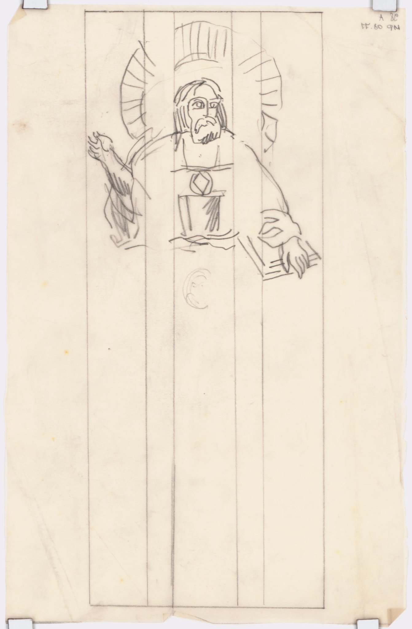 Esquisse pour des vitraux sur le thème de la "carte du ciel" : le Christ du centre de la carte du ciel, auréolé et bénissant de la main droite, tenant un livre fermé de la gauche.