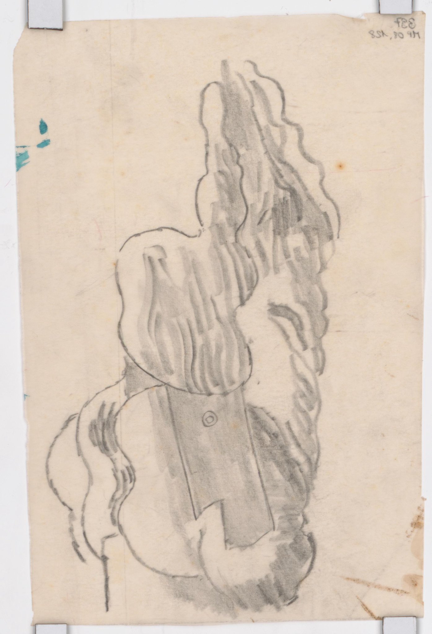 Esquisse pour des vitraux sur le thème de la "carte du ciel" : composition fragmentée dont la partie basse rappelle la forme de la lyre, intégrée dans une masse hachurée évoquant des nuages.