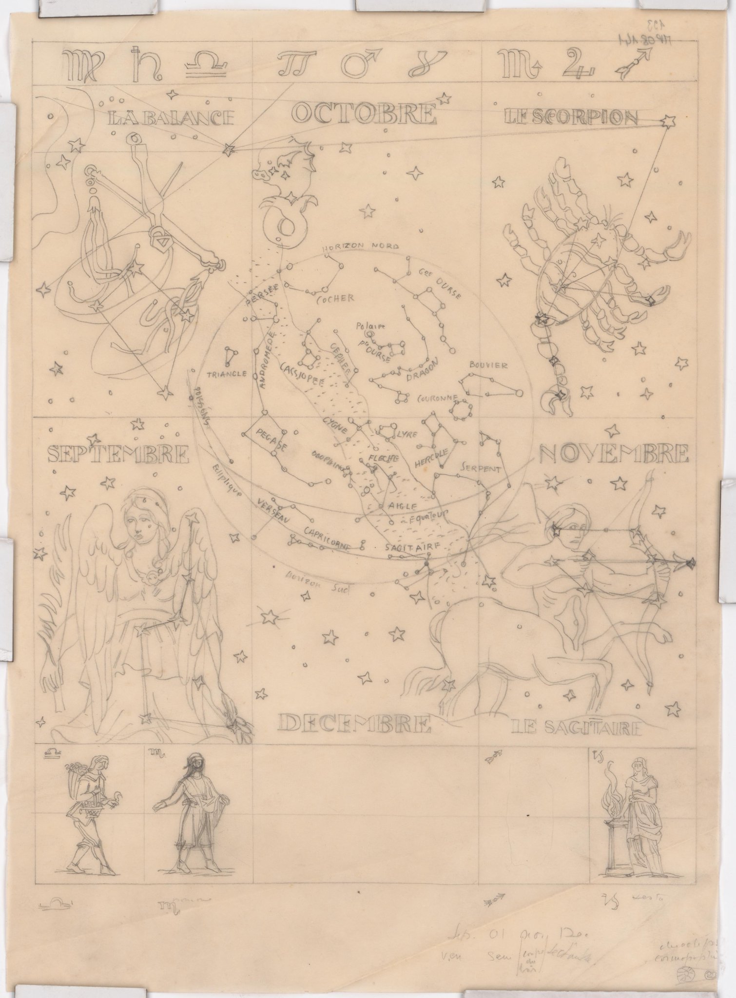 Projet pour les vitraux sur le thème de la "carte du ciel" : les signes du zodiaque représentés autour d'un cercle avec les tracés des constellations. De gauche à droite et de haut en bas : la Balance, le Scorpion, la Vierge et le Sagittaire, et dans la bordure du haut, les symboles des signes du zodiaque et des planètes. En bas, frise incomplète avec travaux des mois (?) ou personnifications liées aux mois.